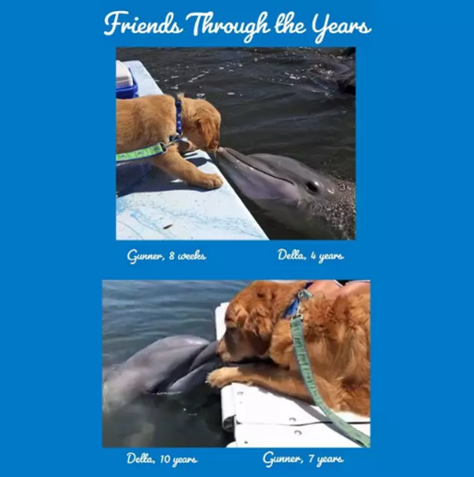 Fotografije su objavljene na Twitteru, a zabilježene su prošlog tjedna. Kako su se proširile internetom saznalo se od strane korisnika We Rate Dogs, da su Delta i Gunner prijatelji od kada je on bio štene. Njemu je sada 7, a njoj 10 godina. Delta se nalazi u Istraživačkom institutu za dupine na Floridi, a psić Gunner ju redovito posjećuje.
