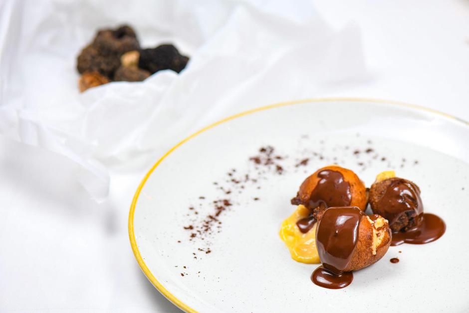 Pripremite prvo kremu. Zagrijte mlijeko, a žumanjke istucite sa šećerom. Dodajte gustin i malo mlijeka te pažljivo promiješajte. Dodajte ostatak mlijeka i opet promiješate. Smjesi dodajte grubo naribanu limunovu koricu te je lagano zagrijte (miješajte neprekidno da se ne zalijepi za dno posude i izgori). Kad se krema počne zgušnjavati, izvadite limunovu koricu, a ulijte sok od limuna. Miješajte dok se ne stisne. Stavite kremu u hladnjak i pripremite fritule. Sve sastojke zajedno umiješajte u glatku smjesu. Stavite ulje na vatru da se zagrije. Žlicom vadite i stavljajte smjesu u zagrijano ulje. Kad je fritula pečena, napunite je žutom kremom i zalijte čokoladom s tartufima.