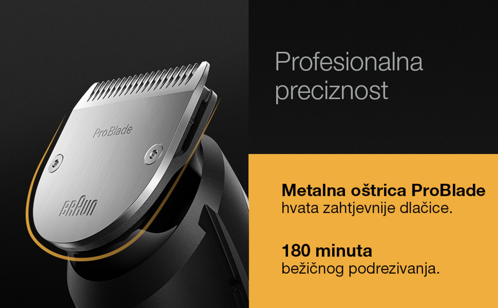 Izgledajte kao da ste upravo došli od brijača bez da izađete iz kuće uz Braunov trimer za bradu Series 9 Professional. Precizan je pri svakom potezu zahvaljujući našoj najoštrijoj oštrici ProBlade dok tehnologija AutoSense osigurava profesionalnu ravnomjernost podrezivanja najrazličitijih brada. Kotačić ProWheel omogućuje precizno podešavanje na 40 postavki duljine a ProLock zaključava vaš odabir. Sve to pokreće baterija koja pruža 180 minuta bežičnog rada.