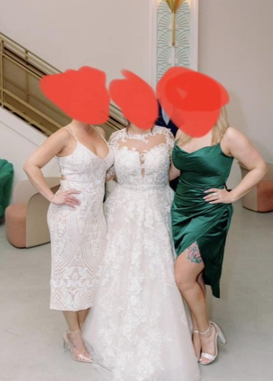 “Djevojka s lijeve strane je ‘plus jedan’ mladenkine prijateljice. Ne može biti tako teško odabrati nešto manje vjenčano. I da, mladenka je bila šokirana i ljuta”, objasnila je u objavi.