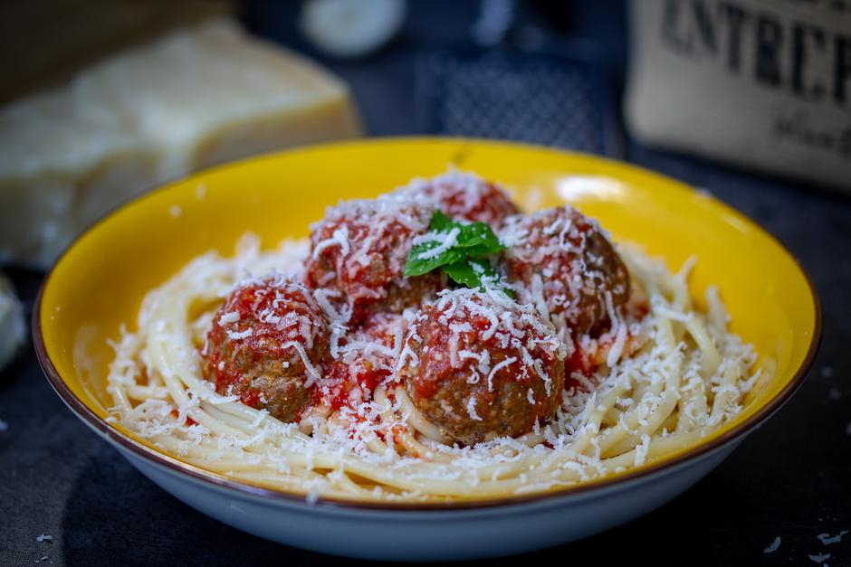 Kruh, češnjak i bosiljak sameljite u blenderu. Crveni luk nasjeckajte tako da od njega dobijete pastu. Pomiješajte meso, začine, samljeveni kruh, češnjak i bosiljak, pastu od crvenog luka, jaje, parmezan i ulje. Od dobivene mase napravite kuglice veličine oraha (ili kolike želite). Poredajte ćuftice u lim na papir za pečenje i pecite ih 15 minuta u pećnici na 200 °C i to dok se malo ne zapeku, taman da se uhvati korica. Dok se ćufte peku vi napravite umak od rajčice: pulpu stavite na zagrijano maslinovo ulje, dodajte pasiranu rajčicu i kuhajte 5 minuta, a zatim štapnim mikserom sve usitnite. Dodajte celer, bosiljak, sol, papar i prstohvat šećera i sve to kuhajte još desetak minuta. Pečene ćufte ubacite u umak, poklopite i kuhajte oko tridesetak minuta. Ćufte možete poslužiti uz pire od krumpira, celera, rižu ili tjesteninu. Naš izbor su ovog puta bile špagete preko kojih smo stavili ćufte, sve bogato prelili umakom i posuli parmezanom.