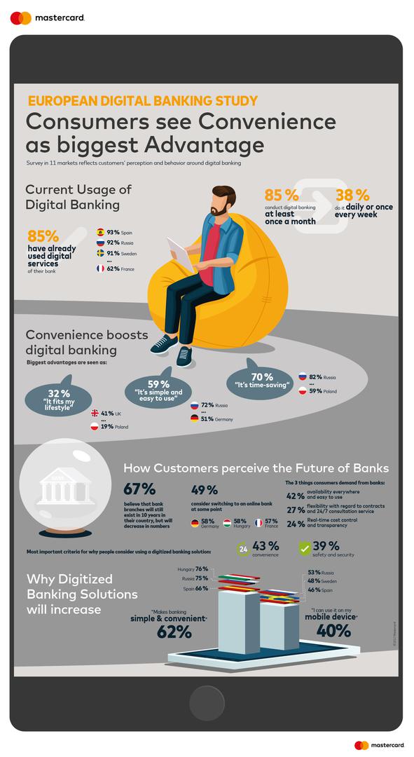 Želja potrošača za jednostavnim, sigurnim i digitalnim rješenjima u bankarstvu raste, potvrdilo je istraživanje koje je kompanija Mastercard provela u 11 europskih zemalja. Rezultati su pokazali da je 85% ispitanika već koristilo digitalne usluge u svojoj banci, a predvodnici su Španjolci s čak 93%, dok su na dnu ljestvice Francuzi sa 62%. Kad je riječ o učestalosti korištenja, više od 85% ispitanika služi se digitalnim (online ili mobilnim) bankarstvom barem jednom na mjesec, a 38% ih to čini na dnevnoj ili tjednoj bazi.