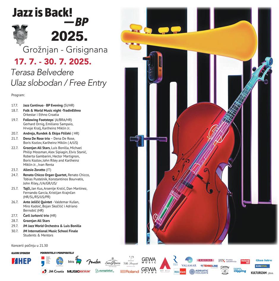Ritam Ljeta u Grožnjanu je poseban, a njegova najprepoznatljivija glazbena kulisa – festival Jazz is Back! BP – i ove će godine od 17. do 30. srpnja pretvoriti ovaj istarski grad umjetnika u jedinstvenu pozornicu na otvorenom. Terasa Belvedere je lokacija s pogledom koji oduzima dah. Grožnjan ponovo postaje dom vrhunskim glazbenicima iz cijelog svijeta i okupljalište publike svih generacija koja na ovaj festival dolazi zbog autentične atmosfere i nezaboravnih glazbenih večeri.