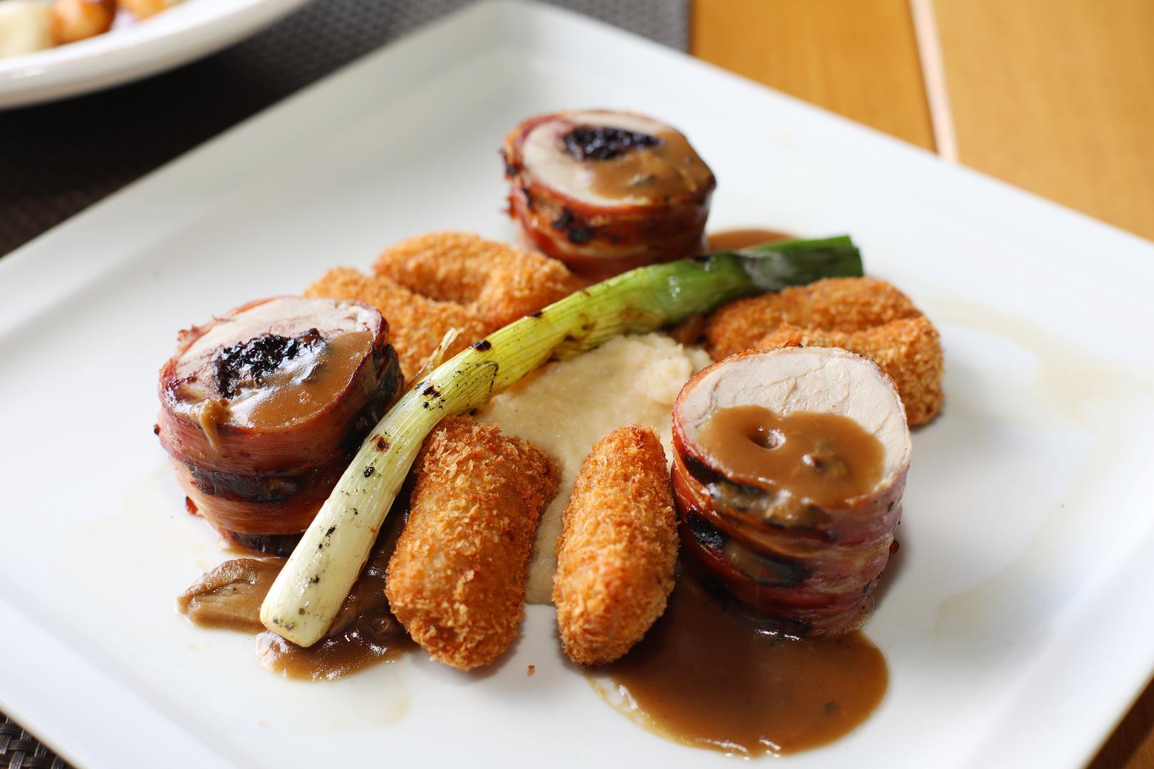Za pire od celera oprati jedan ili dva veća celera, ne guli im se kora, već se stavi u aluminijsku foliju. Prije toga se na celer stavi malo maslinovog ulja i soli, potom se zamota u foliju i stavi peći u pećnicu na 180 stupnjeva dva sata. Nakon pečenja i nakon što se ohladi, skida se kora s celera i usitnjava se u blenderu u pire kojemu se dodaje sol i malo muškatnog oraščića. Kroketi se pripremaju tako da se skuha krumpir te usitni i u zdjeli pomiješa s glatkim brašnom, doda se sol, jaje, šaka parmezana te puno maslaca. Sve oblikovati u meko tijesto, izvaljati u trake, rezati ih u krokete i pohati. Za umak se na maslacu prodinsta luk, pa gljive i vrganji, zatim se podlije goveđim temeljcem. Kuha se dok temeljac ne ispari, a tada se doda žlica gotovog umaka od kostiju (kosti koje se 12 sati kuhaju u vodi). Lungić se potom puni suhim šljivama i omota se pancetom, odnosno suhom slaninom. Tako pripremljen lungić stavi se kratko na roštilj, tek toliko da se stvori korica, zapeče površina na svim stranama. Nakon toga lungić se stavi u pećnicu na 180 ili 190 °C na 10-12 minuta (ovisi o veličini i debljini lungića), tako da bude srednje pečen. Kada je lungić pečen, režemo ga na medaljone, ispadnu tri medaljona, njima se na tanjur doda pire od celera, a sve se zalije umakom od gljiva vrganja. Na vrh na tanjuru za ukras se stavi komad mladog luka kuhanog u vakuumu 45 minuta.