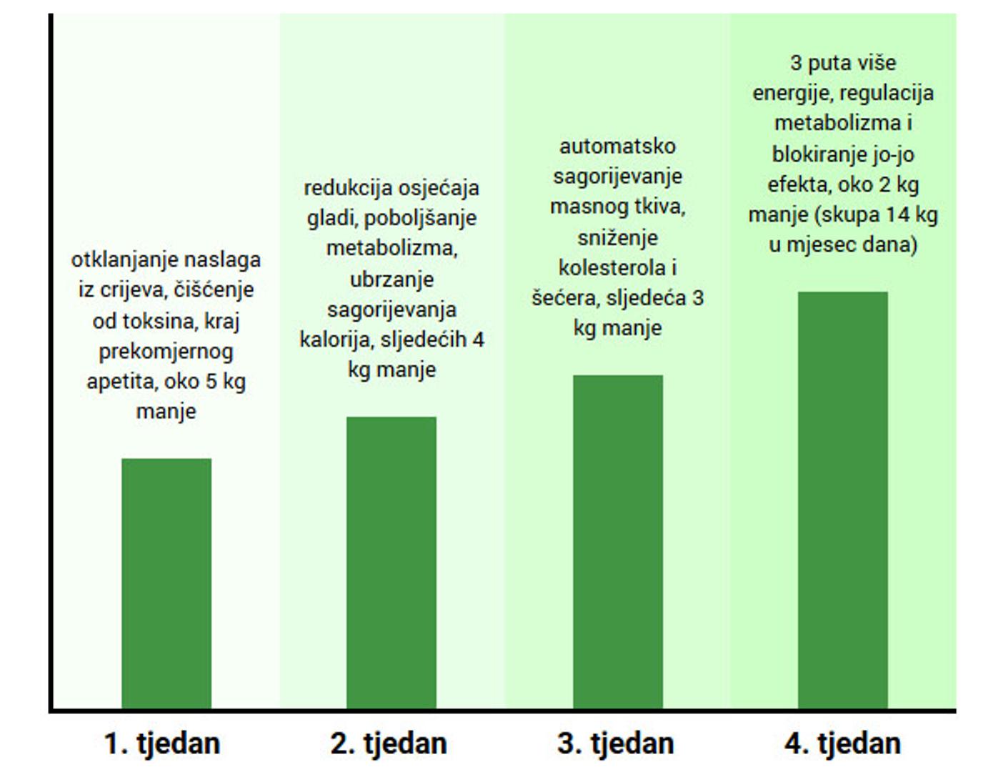 Te osobe su već u roku od nekoliko sati nakon prve uporabe počele čistiti organizam od naslaga i toksina, zahvaljujući čemu su ugušile prevelik apetiti, zbog čega su mogle ući u fazu intenzivnog sagorijevanja kalorija. U roku od sljedećih nekoliko dana, ispitanici su prestali jesti zbog stresa i potpuno su savladali napadaje gladi. Zatim, iz dana u dan su promatrali kako težina opada, a mjere kukova, struka i bedara se smanjuju za čak nekoliko centimetara dnevno!