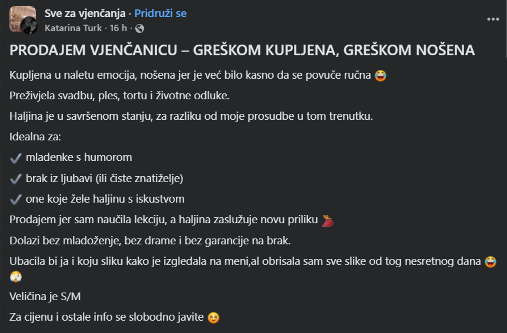 U moru uobičajenih objava o potrazi za savršenim cvijećem, bendom ili lokacijom, oglas jedne Hrvatice u Facebook grupi "Sve za vjenčanja" odjeknuo je poput groma. Dok većina prodavačica svoje vjenčanice opisuje s nostalgijom, ova je korisnica odlučila ići potpuno drugačijim, neočekivano iskrenim putem. Već je sam naslov, napisan velikim slovima, dao naslutiti da se ne radi o klasičnoj prodaji: "PRODAJEM VJENČANICU – GREŠKOM KUPLJENA, GREŠKOM NOŠENA".
