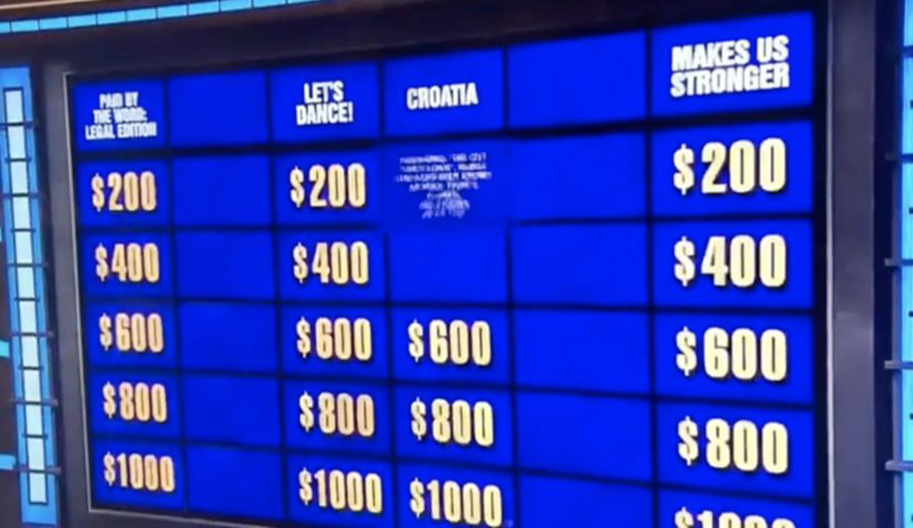 Jeopardy!: Hrvatska je kao kategorija predstavljena u legendarnoj američkoj televizijskoj igri Jeopardy! prvi put prošli tjedan. Iako je u emisiji bilo dosta pitanja vezanih uz Hrvatsku, ovo je prvi put da postoji posebna kategorija.