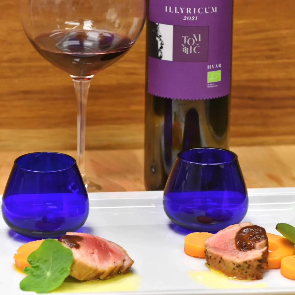 Četvrti slijed – lungić i batat s umakom od suhih šljiva i crnog vina, dozvao je crno vino, Tomićev Illiricum 2021, uz ulja Selekciju i aromatično maslinovo ulje s čilijem. Čili je bio malo prejak za vino, ali onima koji vole ljuto – kombinacija se svidjela. U čaši je bio odlični cuvée cabernet sauvignona i plavca malog kultnoga hvarskog vinara Andre Tomića, poznatog, osim po sjajnim vinima i po izjavi “Vino se pije na ure, ne na litre!”