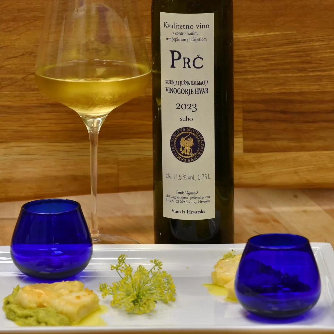 Treći je slijed bio bakalar uz kremu od poriluka, poslužen uz ulja Selekciju i Leccino. Leccino (monosortno ulje pojačane gorčine i pikantnosti) jelu je dao egzotičnost, ali uz posluženo vino Selekcija je odnijela pobjedu. Selekcija je višesortno ulje od oblice, lastovke, levantinke i leccina. Ulje je slatko, srednjeg intenziteta, blage gorčine i pikantnosti, harmonično i ugodno. U čaši je bio prpošni mošusni Prč 2023 vinarije Vujnović iz Sućurja, još jedna izvorna sorta otoka Hvara koju (prč ili parč je naziv za jarca koji u doba parenja ispušta intenzivne i ne baš uvijek ugodne mirise), nazivaju afrodizijakom pa je time kombinacija bila još intrigantnija.