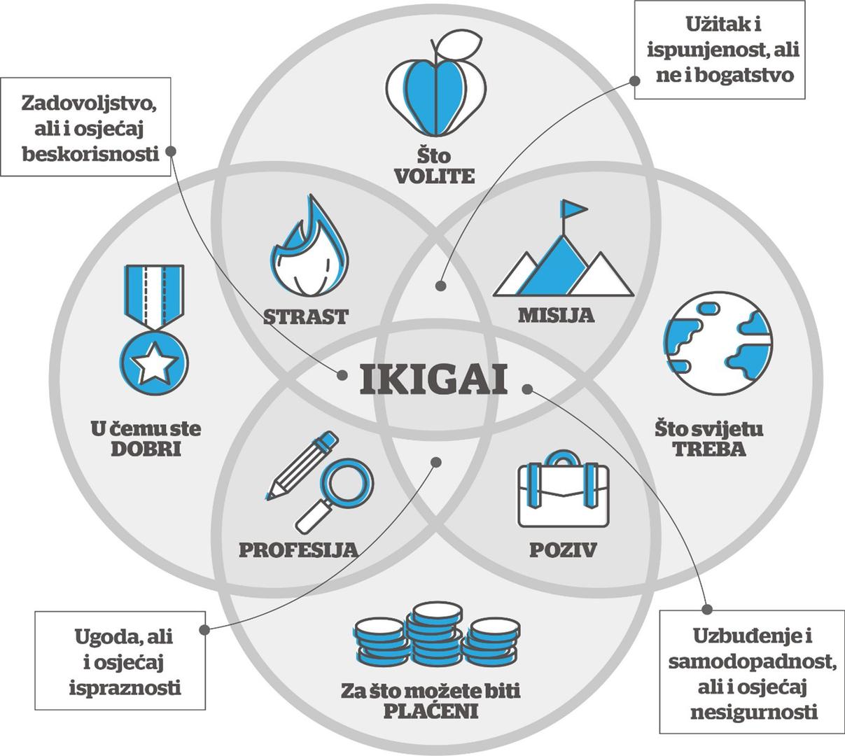 Ikigai se nalazi u sjecištu četiriju stvari, a to su: stvari koje volite – vaša strast, stvari koje su svijetu potrebne – vaša misija, stvari u kojima ste dobri – vaš poziv i stvari za koje možete biti plaćeni – vaša profesija. Bitno ga je otkriti i prepoznati jer ukoliko se ne stvori sinergija između navedene četiri stvari, nikad nećemo osjetiti potpuno zadovoljstvo. Na primjer, ako radite nešto što volite, u čemu ste dobri i što je svijetu potrebno, no za to ne možete biti plaćeni, osjećat ćete oduševljenje i ispunjenost, ali nećete biti bogati u materijalnom smislu. S druge strane, ako radite nešto u čemu ste dobri, za što ste plaćeni i što svijetu treba, živjet ćete ugodno, ali imat ćete osjećaj praznine jer ne radite nešto što volite.