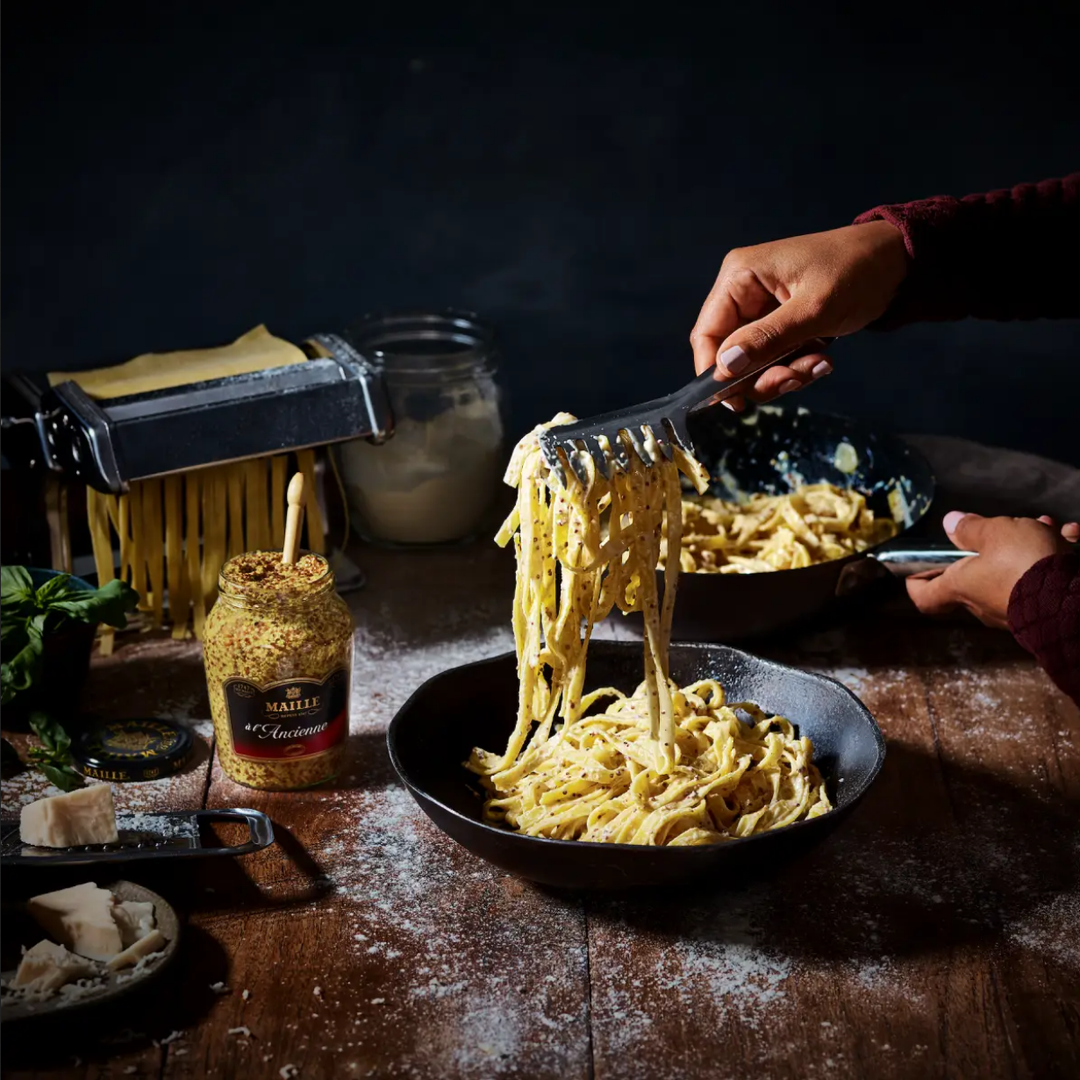 Za drugo posluživanje, međuobrok ili lagani ručak, isprobajte tjesteninu u umaku od parmezana upotpunjenu Maille senfom. Ovo jelo osvaja svojom jednostavnošću i punoćom okusa te je omiljeno je kod svih generacija.
