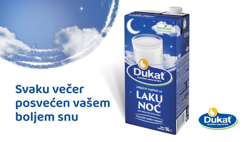 Uvažavajući razmjere problema sa spavanjem hrvatskih građana Dukat je predstavio novi i inovativni i prirodni funkcionalni proizvod – Dukat Laku noć, mliječni napitak koji pomaže lakše zaspati, a sadrži ekstrakt melise, lipe te esencijalnu aminokiselinu triptofan. „Pomaže lakše zaspati“ ujedno je zdravstvena tvrdnja koju nosi ovaj proizvod, a odobrena je od strane Ministarstva zdravstva.