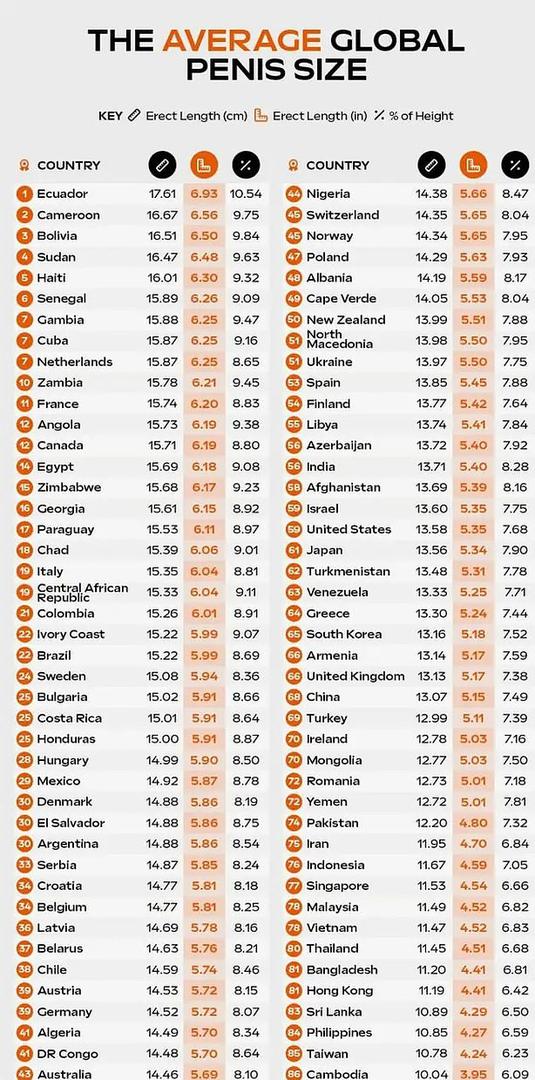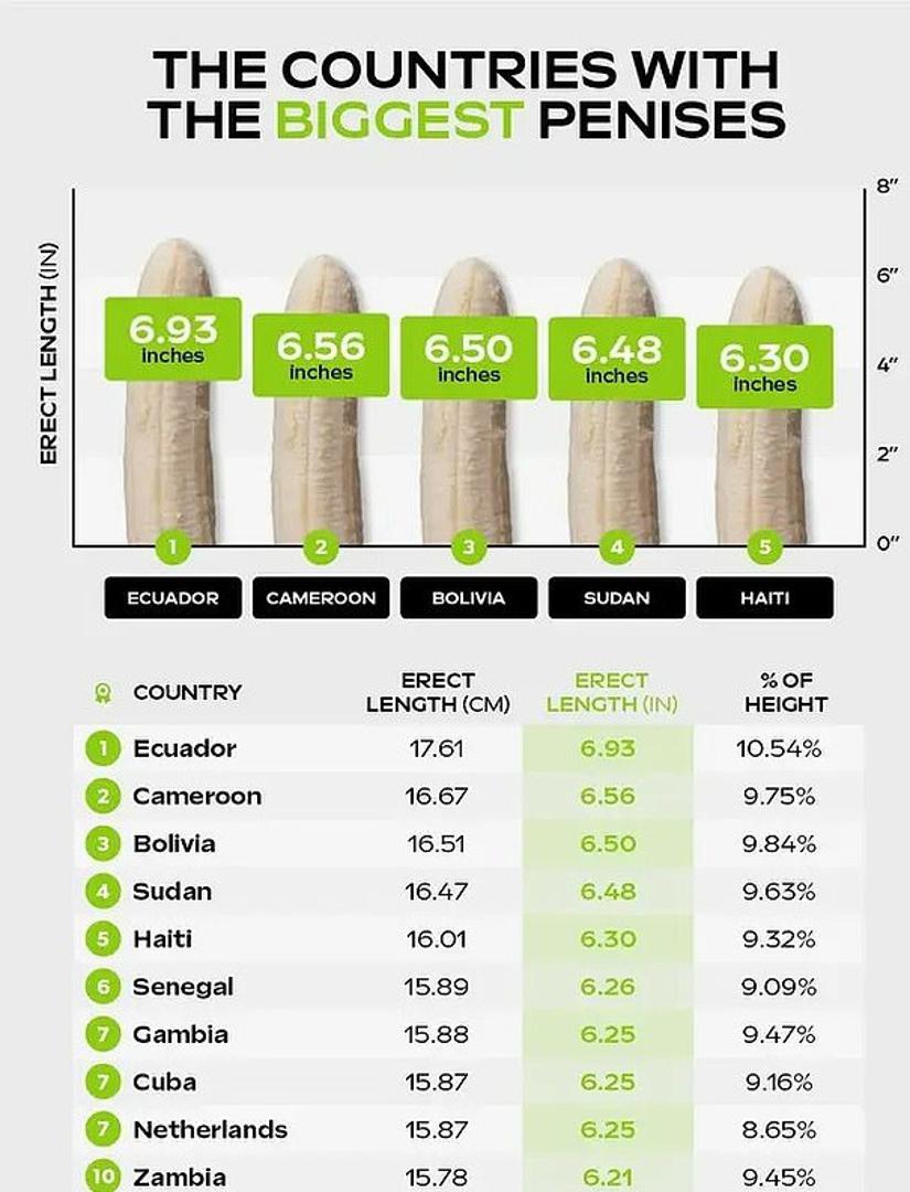 Ekvador je zauzeo prvo mjesto kao zemlja s najvećom prosječnom veličinom penisa od 17,61 cm, što je čak 10 posto više od njihove prosječne visine. Afrička nacija Kamerun je na drugom mjestu s prosjekom od 16,67 cm, a slijedi ga Bolivija u Južnoj Americi sa 16,51 cm. Sudan i karipska država Haiti zaokružili su top pet sa 16,47 cm, odnosno 16,01 cm.