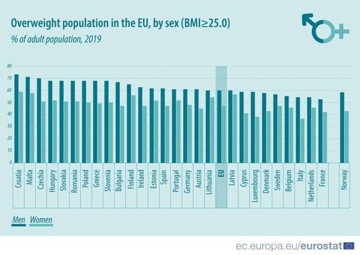 Odmah iza Hrvatske je Malta s nešto manjim postocima, a s najmanje pretilih mogu se pohvaliti Italija (46 posto), Francuska (47 posto) i Luksemburg (48 posto).