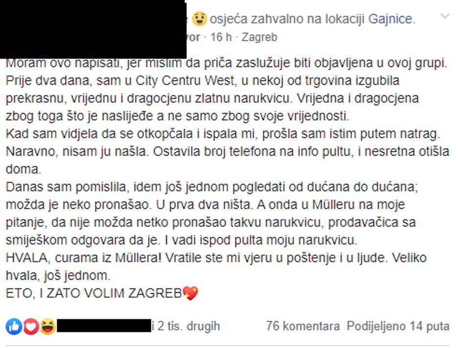 - Danas sam pomislila, idem još jednom pogledati od dućana do dućana; možda je neko pronašao. U prva dva ništa. A onda u Mülleru na moje pitanje, da nije možda netko pronašao takvu narukvicu, prodavačica sa smiješkom odgovara da je. I vadi ispod pulta moju narukvicu. HVALA, curama iz Müllera! Vratile ste mi vjeru u poštenje i u ljude. Veliko hvala, još jednom. ETO, I ZATO VOLIM ZAGREB - dodala je ova Zagrepčanka koja je sretna što je ponovno ugledala svoju narukvicu.