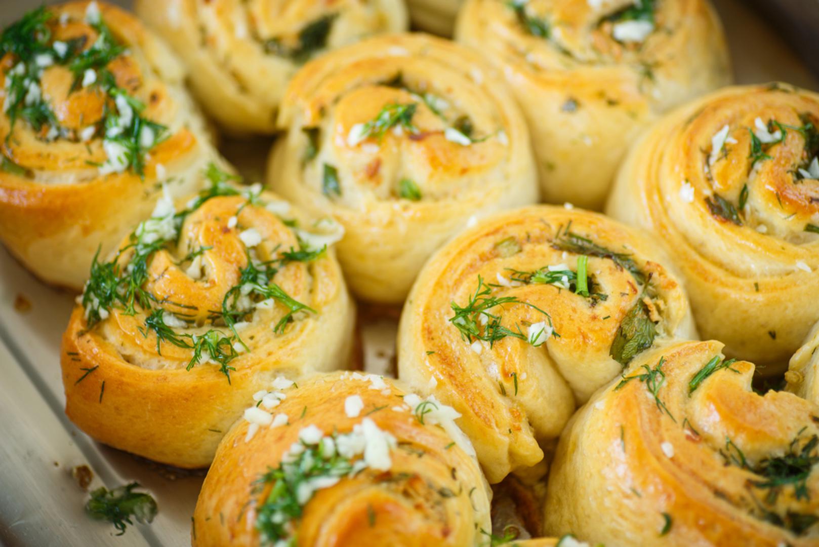 Tijesto razdijelite na dva dijela. Jedan dio razvucite na lim pa na njega rasporedite pola smjese s krem sirom s tim da ostavite jedan prazan rub širine oko 5 cm. Zarolajte tijesto pa ga narežite na 18 komada. Narezane komade složite na pladanj, pokrijte i ostavite u hladnjaku preko noći ili barem 45 minuta ako ćete ih peći isti dan. Drugu polovicu tijesta možete zalediti za neku drugu priliku. Zagrijte pećnicu na 220 °C. Kruh pecite 20 minuta ili dok ne porumeni. Pošpricajte ga s malo maslinova ulja i poslužite.