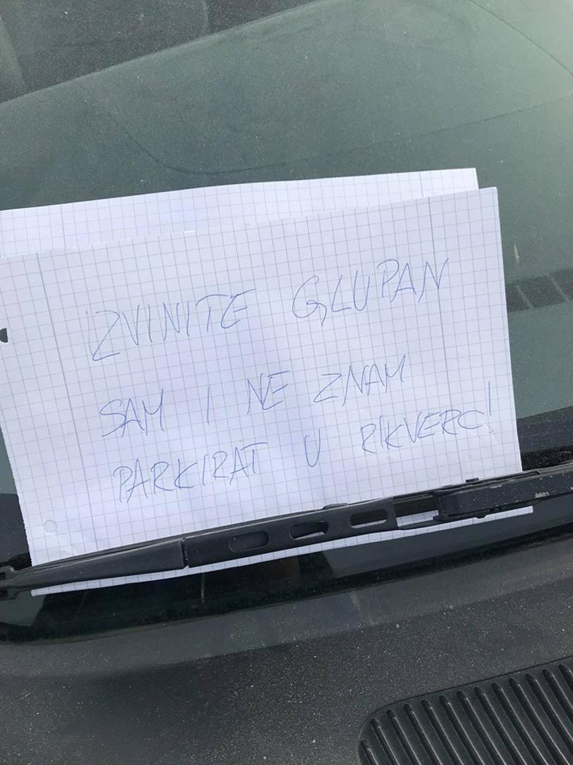 Na prednjem staklu ispod brisača osvanula je poruka "Izvinite, glupan sam, i ne znamparkirat' u rikverc", a mnogi misle da to nije napisao sam vozač već neki šaljivdžija u prolazu.