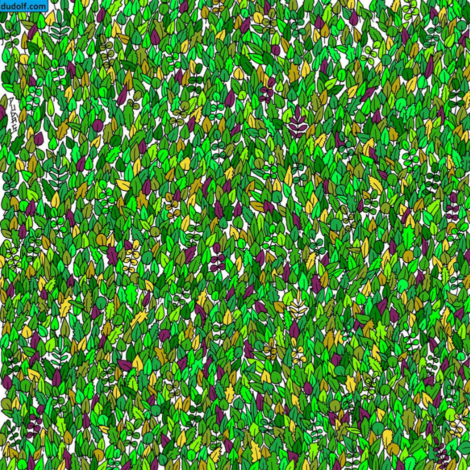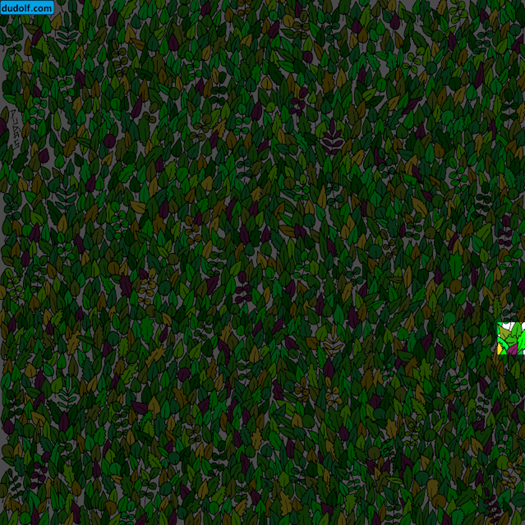 Slika prikazuje mnogo lišća različitih oblika i u raznim bojama, a među njima je potrebno pronaći zelenu žabu. Upravo s obzirom na to da je lišće potpuno različito je i teško uočiti malu žabu.