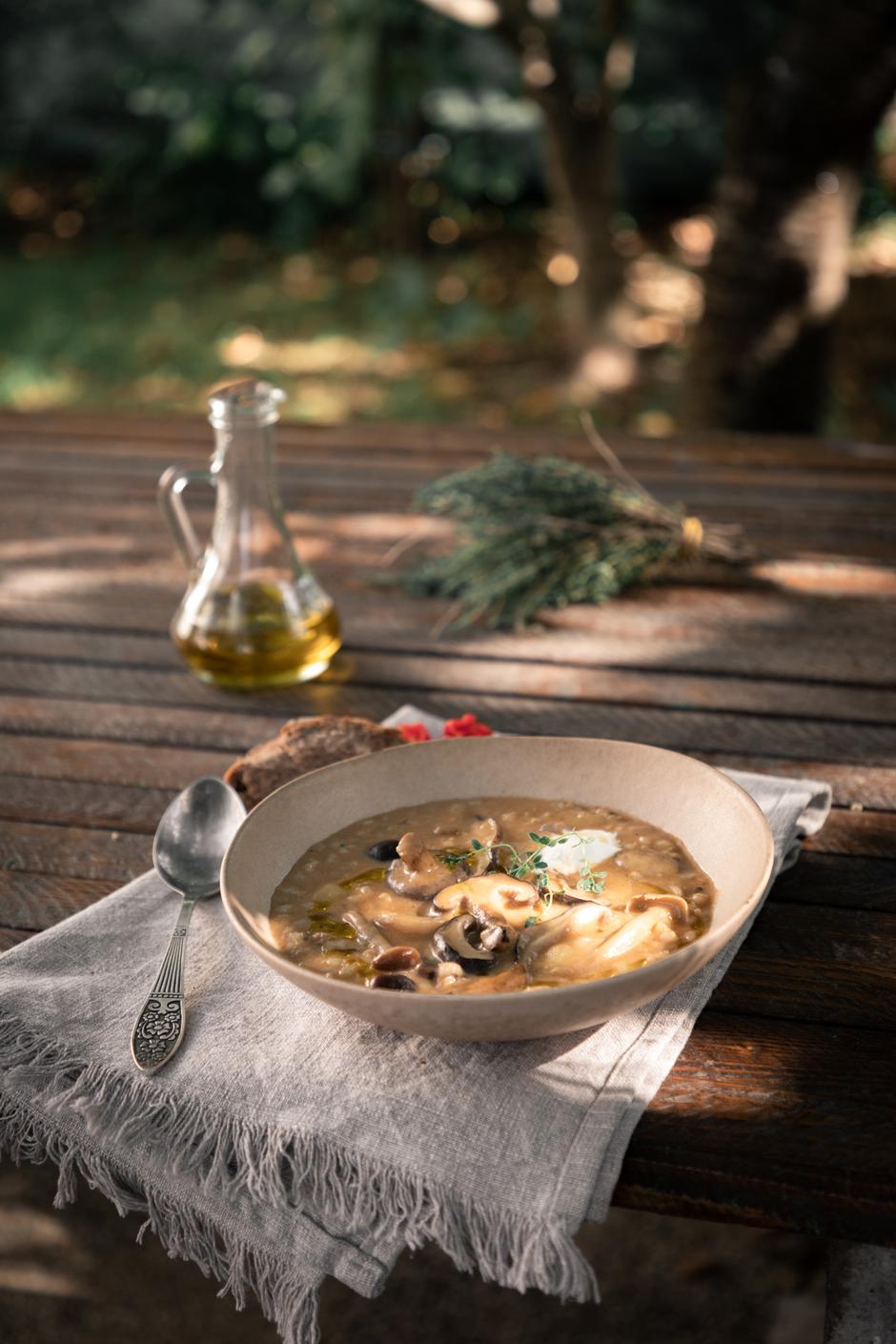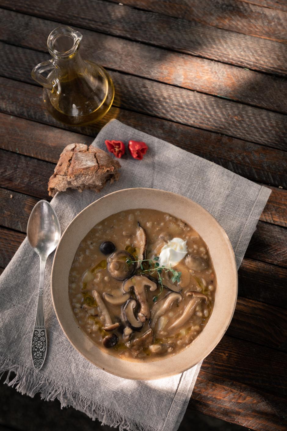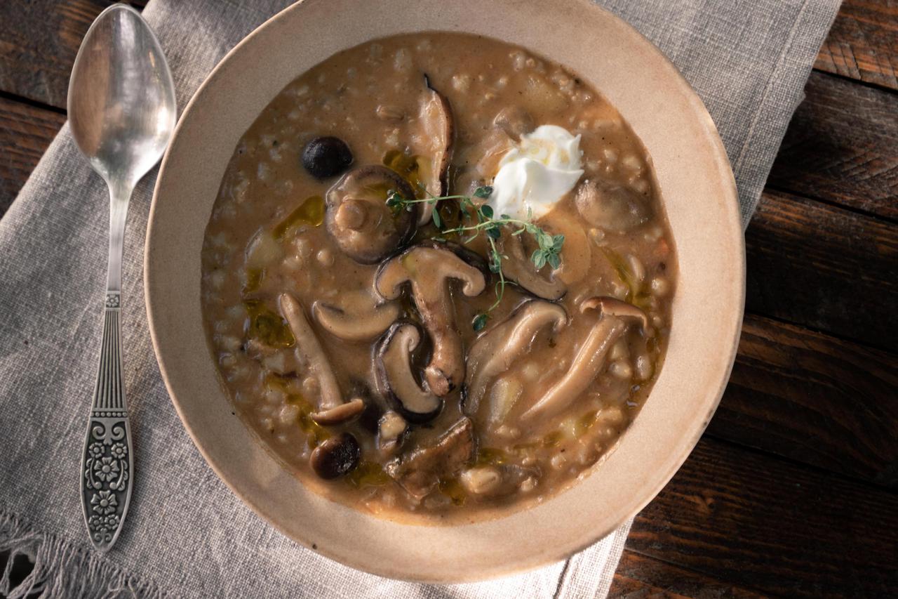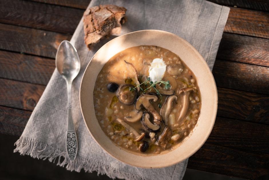 Vrganje prelijte kipućom vodom i ostavite da omekšaju. Na zagrijani maslac dodajte nasjeckani luk i pržite ga par minuta, dodajte slaninu narezanu na sitne kockice i skupa pržite dok slanina ne dobije lijepu boju. Dodajte nasjeckani češnjak, pa čim zamiriše dodajte ječam, vrganje s vodom u kojoj su se namakali, sol, papar i mljevenu papriku, prelijte temeljcem ili vodom pa kad provrije kuhajte 20-25 minuta. Dodajte timijan, ljutu papričicu, nasjeckane šampinjone, shiitake i jablanovače. Dodajte naribani pecorino sir, kuhajte još par minuta i poslužite uz par kapi maslinova ulja i žličicu kiselog vrhnja ili mascarpone sira.