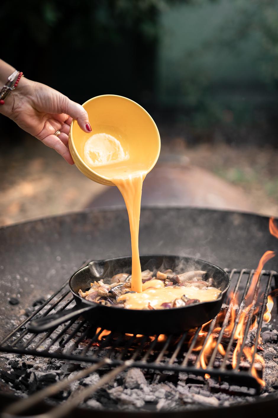 U zdjeli umutite jaja. Na vrućoj tavi zagrijte maslinovo ulje i maslac, dodajte luk narezan na ploške i miješajte dok ne omekša, dodajte gljive (one veće narežite na ploške, a manje ostavite cijele). Pržite par minuta, uz miješanje, zatim začinite i prelijte jajima i pecite još par minuta.