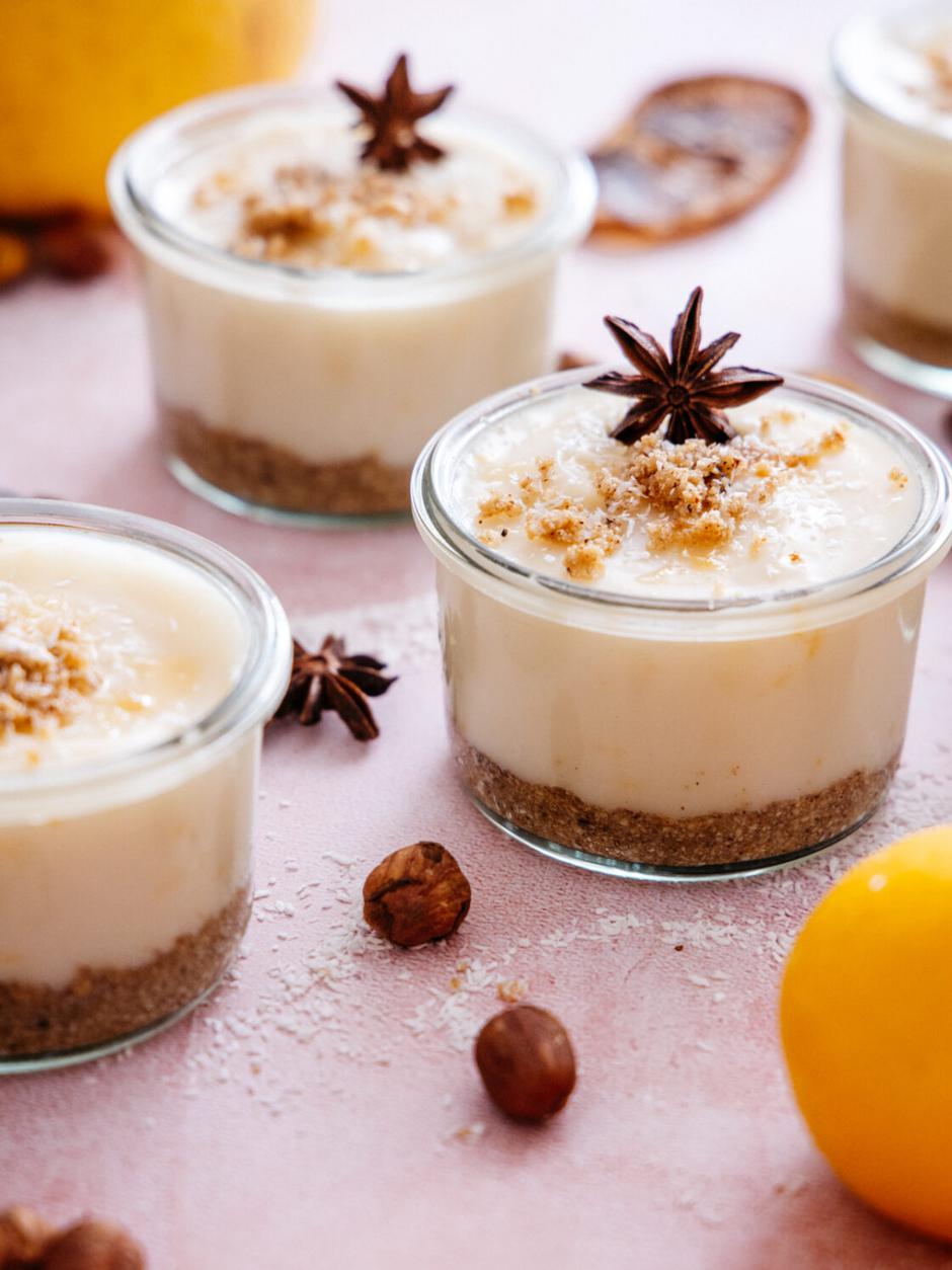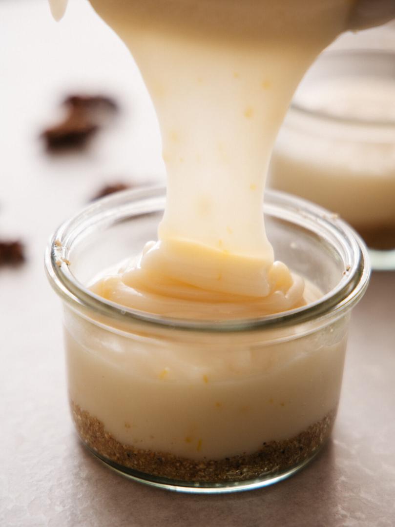 Sada napravite kremu od grejpa. Polako zagrijavajte kokosovo mlijeko sa zvjezdastim anisom, limunovom koricom, šećerom i procijeđenim sokom od grejpa. U drugu zdjelicu ulijte bademovo mlijeko i škrob i miješajte da ne nastanu grudice. Kada kokosovo mlijeko bude vruće, dodajte miješavinu mlijeka i škroba i miješajte dok se ne zgusne.