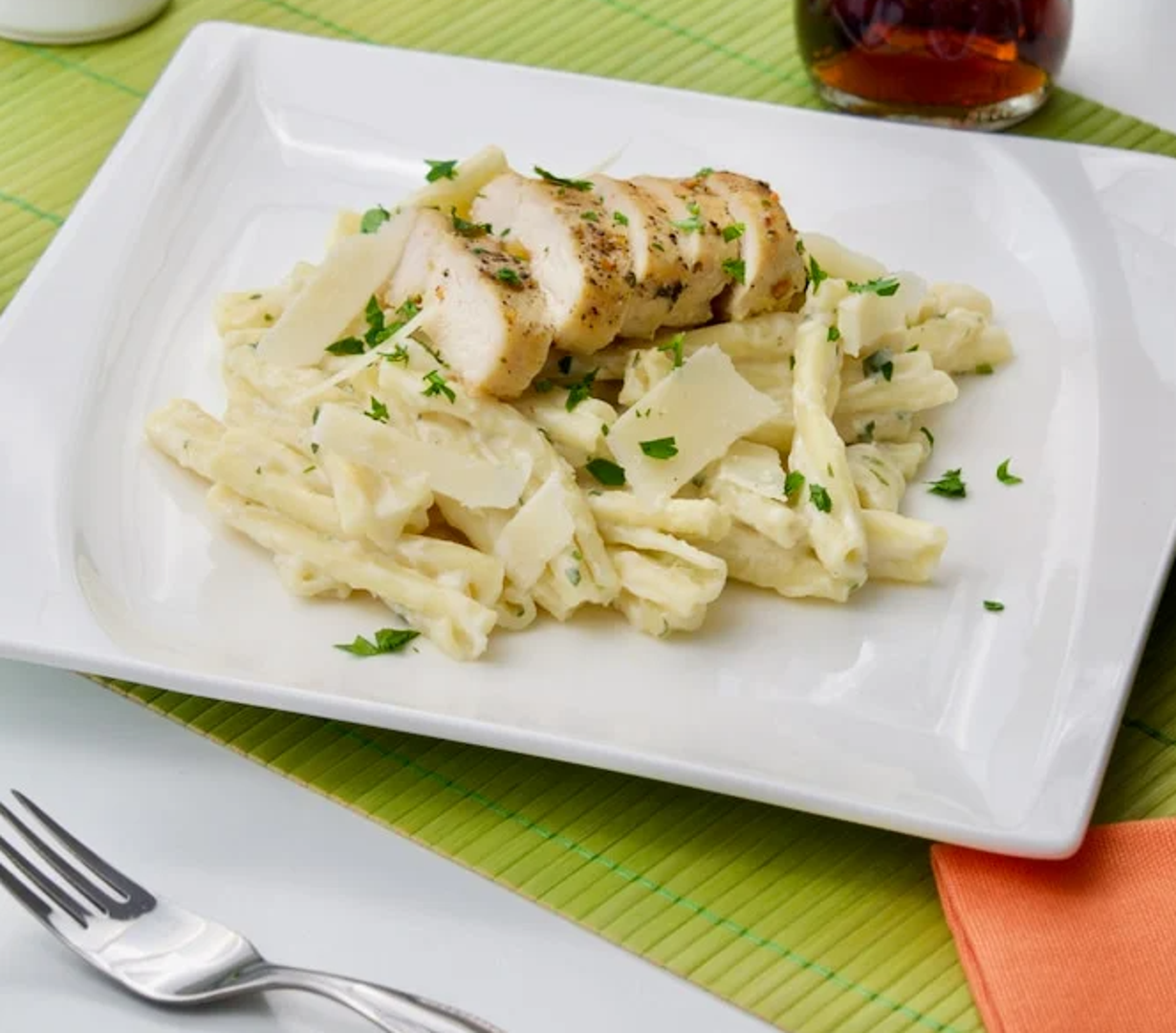 Priprema: U veću količinu slane vode staviti kuhati tjesteninu. U gril tavi na malo ulja pržiti pileći file sa svake strane po 3-4 minute. Nakon što ste file ispržili, začinite ga da soli i paprom te ga odložite na toplo do posluživanja. U tavici otopiti maslac na niskoj temperaturi. Odmah dodati vrhnje za kuhanje i uz miješanje pustiti da prokuha. Dodati protisnuti češnjak i naribani parmezan pa miješati tako dugo dok se sve skupa ne otopi i ne sjedini. Kada se to dogodi, vrijeme je da umak malo pojačamo i razrijedimo. Znači, sada je vrijeme da mu dodate vodu u kojoj se kuhala tjestenina. Vodu dodajte malo-pomalo uz miješanje. Bit će potrebno otprilike 10 žlica vode. Ako vam je umak i nakon toga pregust (a mogao bi biti, jer voda od kuhanja tjestenine zna zbog škroba koji ostane u njoj od tjestenine jako zgusnuti jela), dodajte mu malo obične vode. Umak svakako prije miješanja s tjesteninom kušajte te mu po potrebi popravite okus. Na kraju mu dodajte sitno sjeckani svježi peršinov list. Vrijeme je da završite ručak. Pomiješajte kuhanu tjesteninu s umakom, na vrh svakog tanjura stavite i narezani file i poslužite toplo.