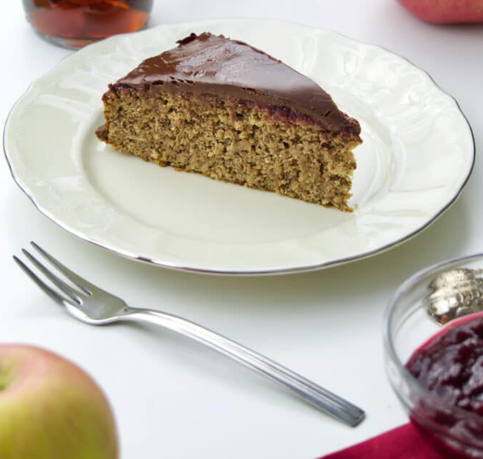 Priprema: Miksati cijela jaja sa šećerom i vanilin šećerom. Nakon nekoliko minuta dodati ulje pa opet promiksati. Polako dodavati i sve ostale sastojke. Na kraju dodati naribane jabuke i ručno ih umiješati. Ovako dobivenu smjesu premjestiti u kalup promjera 24 cm, poravnati i peći u pećnici zagrijanoj na 180 stupnjeva 35- 40 minuta. Pečeni kolač malo prohladiti pa mu površinu premazati pekmezom. Pripremiti čokoladni ganache tako da se u lončiću na jako slaboj vatri zagrije slatko vrhnje i u njemu otopi čokolada. Ganacheom preliti kolač i pustiti da se ohladi