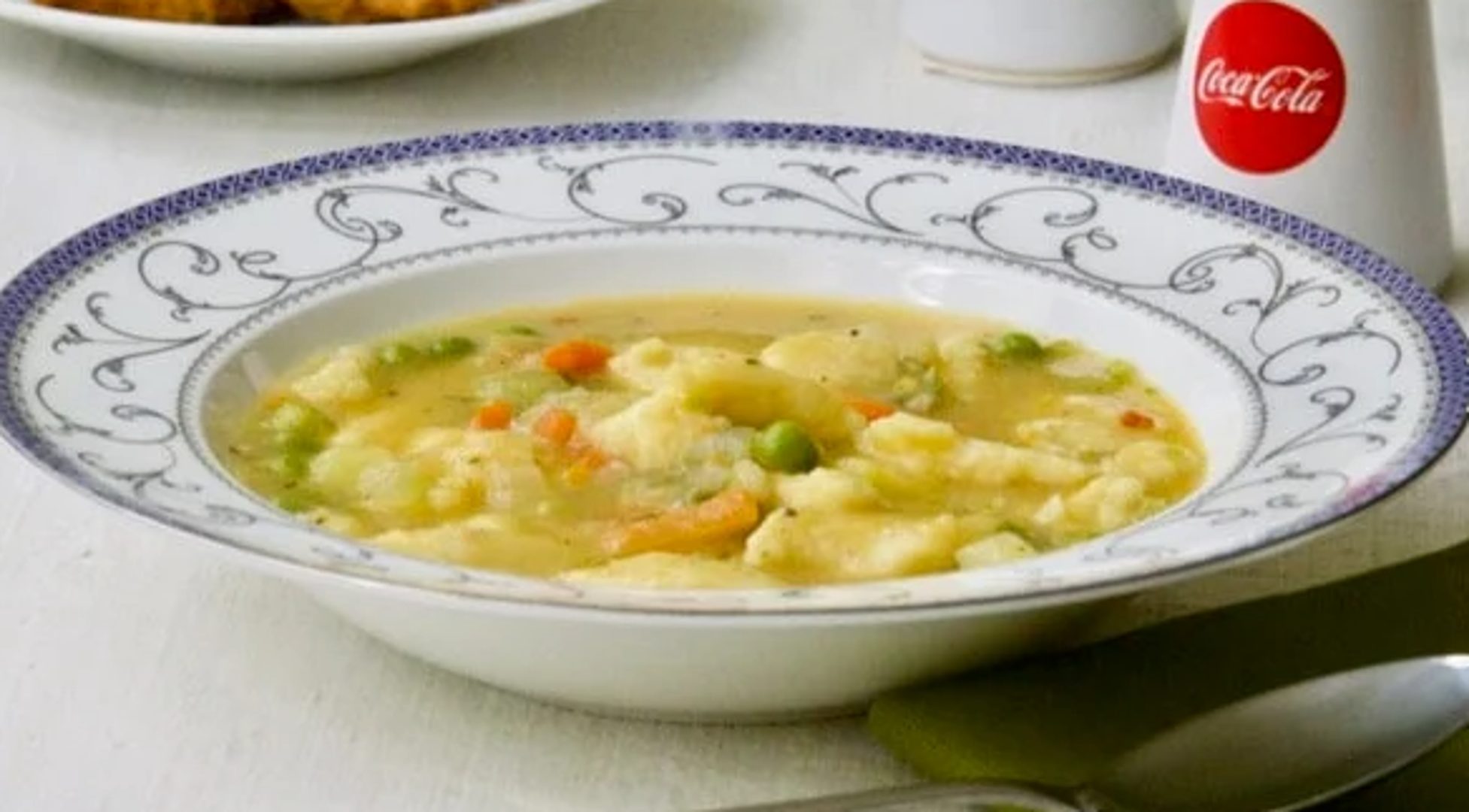 Sastojci: - 2 otkoštena pileća nadbatka - 1 pileći file - 1 luk - 4 mrkvice - 200 g graška - 1 veći poriluk - pola glavice cvjetače - manji komadić celera - 2 žlice oštrog brašna - 2 žlice sjeckanog peršinovog lišća - 2 l vode - sol, papar Za noklice: - 2 jaja - 4 žlice pšeničnog griza - 4 žlice oštrog brašna