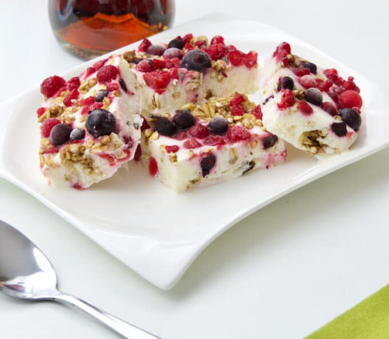 Priprema: Jogurt pomiješati s medom. Dodati polovicu nasjeckanog voća i granole pa promiješati. Izliti masu na pladanj prekriven masnim papirom i poravnati. Odozgo posipati ostatkom voća i granole. Sve skupa staviti u zamrzivač na 2-3 sata da se zamrzne. Zamrznute jogurt pločice izvaditi i izrezati ili natrgati na komade željene veličine i uživati u prefinom okusu