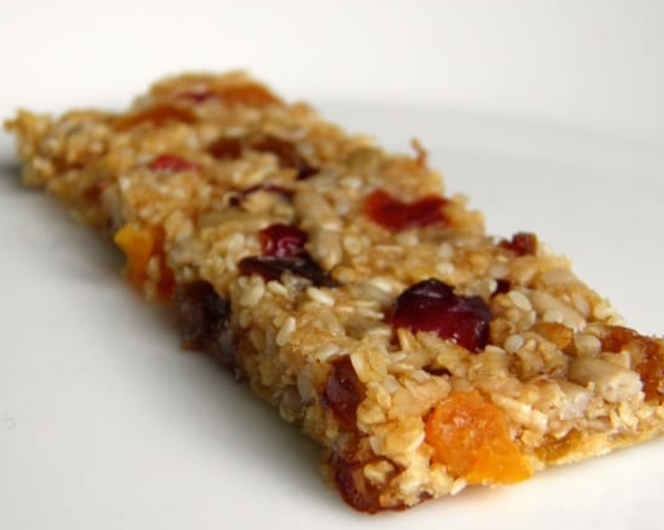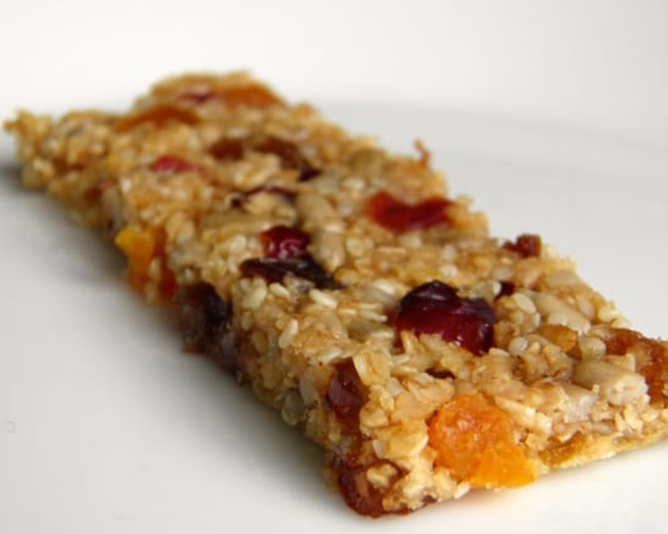 Priprema: Bananu usitniti vilicom da bude kaša. Sjemenke sezama popržiti da zamirišu. Brusnice i marelice sitno nasjeckati. U posudi pomiješati sve sastojke, dobro promiješati pa u maslacem premazan lim nanijeti smjesu pritiskanjem u sloju debljine cca 5-7 mm. Peći u pećnici na 150ºC 30 minuta. Ohladiti i rezati na ploškice ili bilo koji drugi oblik.