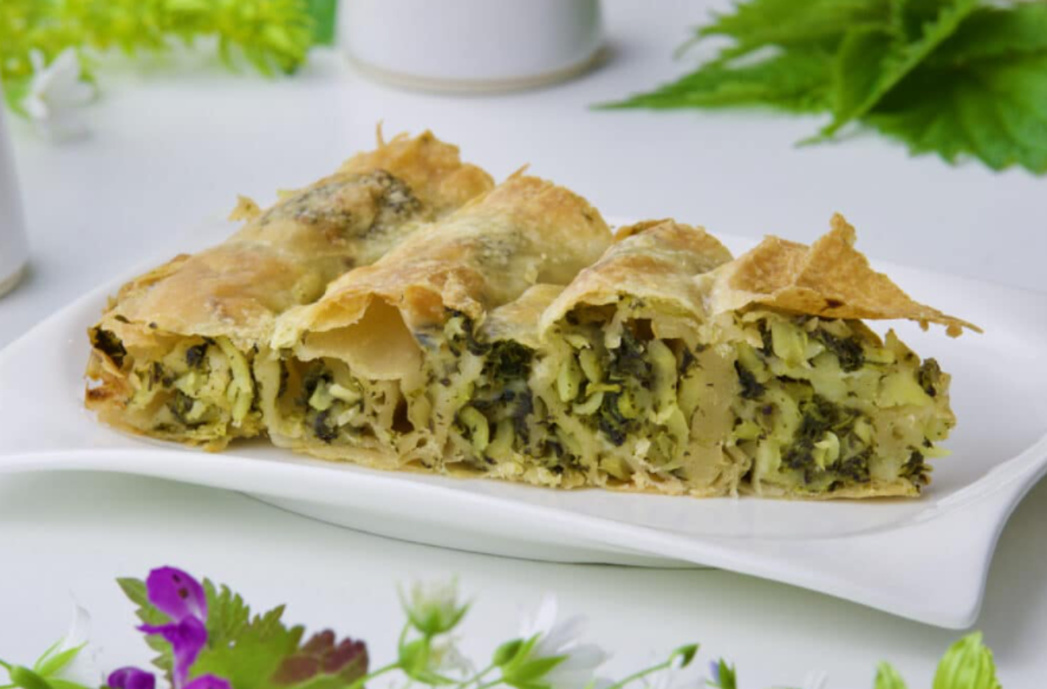 Priprema: Koprive oprati pa ih kratko blanširati - dovoljno je da ih uronite u kipuću vodu na 5 do 10 minuta. Vodu od blanširanja svakako bacite jer u njoj se nalazi mravlja kiselina iz listova koprive koja bi mogla naškoditi vašem želucu. Krumpir oguliti i naribati na krupniji ribež, a luk sitno nasjeckati. Pomiješati u posudi naribani krumpir, koprivu koju ste ocijedili i sitno nasjeckali, luk, sirni namaz i jaje, začiniti po ukusu i dobro promiješati. Nadjevom premazivati kore, raditi rolade, složiti ih u lim na papir za pečenje, premazati lagano uljem i peći u pećnici na 175ºC 30 minuta. Izvaditi pitu, preliti je temeljcem i vratiti u pećnicu na još 15 minuta. Pita je gotova kada upije sve sokove od temeljca i kada lijepo porumeni