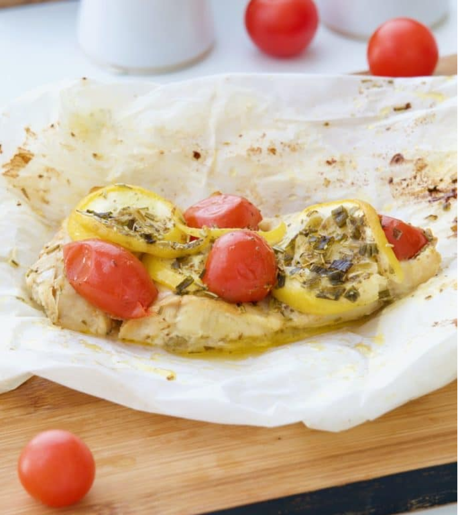 Sastojci: - 800 g filea oslića - 5 krumpira - 2 crvena luka - 2 limuna - 10 cherry rajčica - 1 žličica ružmarina - 1 žličica origana - 1 žličica vlasca - 1 žličica soli - prstohvat papra - 100 ml maslinova ulja - 12 kom papira za pečenje