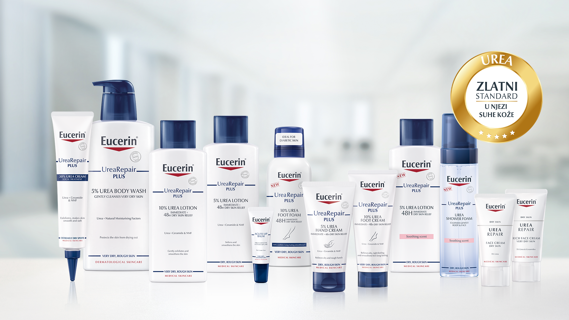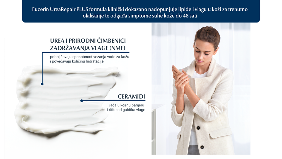 Budući da je izuzetno važno kožu nahraniti, treba birati preparare bogate ureom poput onih iz linije Eucerin UreaRepair PLUS koja uključuje sredstvo za čišćenje, losione za tijelo, kreme – zajedno s proizvodima za njegu ruku i nogu te intenzivnu kremu za lokalnu primjenu na problematičnim područjima izrazito suhe kože koji su dostupni s različitom koncentracijom ureje, ovisno o stanju suhoće kože.UreaRepair PLUS linija djeluje na uzroke i posljedice stanja kože osoba s dijabetesom te poboljšavaju sposobnost vezanja vode za kožu i povećavaju količinu hidratacije, dok ceramidi i ostali lipidi jačaju kožnu barijeru kako bi dodatno zaštitili kožu od gubitka vlage.