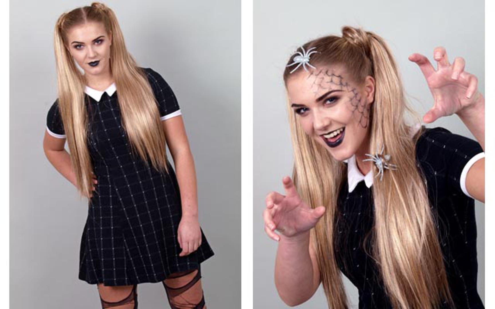 Kad je gotov total look krenite s frizurom i make up-om. U svaranju ovog tutorijala svoju je ideju dala šminkerica Nera Brumen koja je predložila duge kikice i paukovu mrežu na licu. Za ovakvo šminkanje potrebno je dobro jednolično matirati lice i usne prekriti puderom. Crnom olovkom nacrtajte na licu paukovu mrežu koju prstima ublažite kako biste dobili sjene. Crtajte paukovu mrežu u veličini koja vam se najviše sviđa, a na usne ne zaboravite staviti tamni ruž. Mi smo koristili Catrice crni ruž za usne, a ako ga nemate u svojoj kozmetičkoj torbici može vam poslužiti i crna olovka za usne preko koje obavezno stavite lip balm ( kako se usne ne bi osušile).