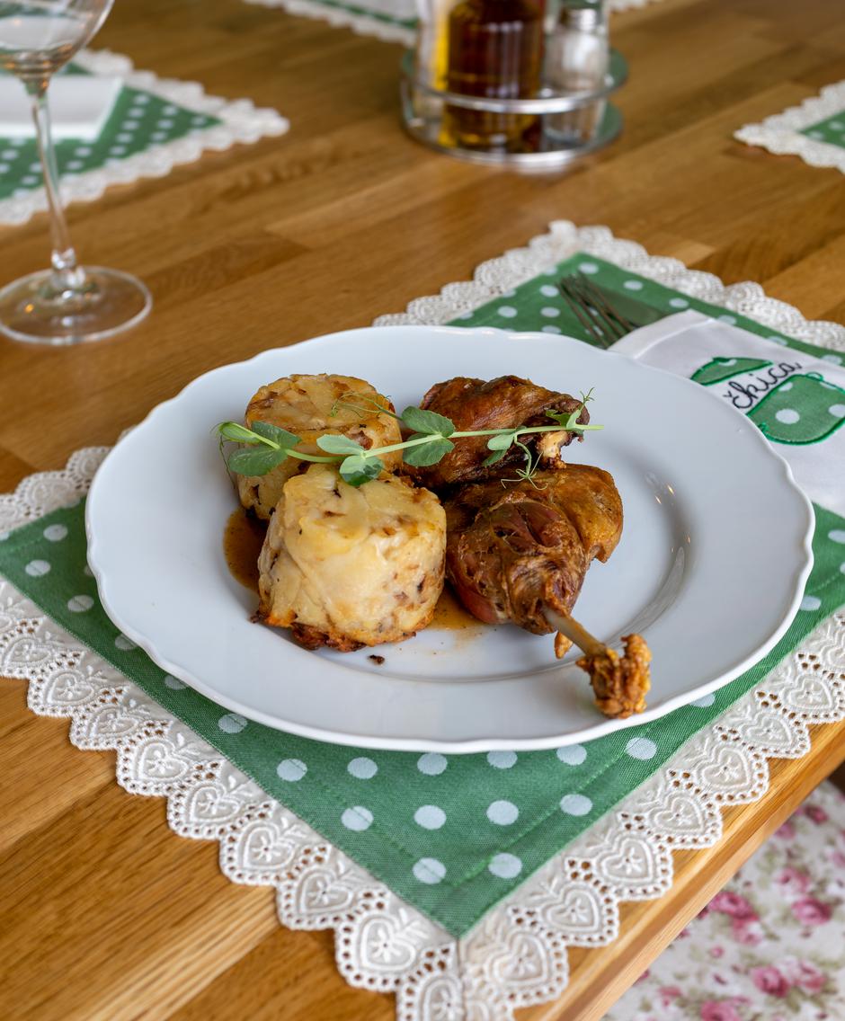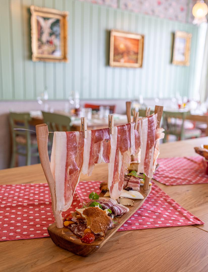 To je zbog toga što su fete pršuta Alduk povješane na štrik kao veš na sušenju! Inače, kada negdje vidite Aldukov pršut, ne zaobilazite ga jer je riječ doista o pravoj deliciji. Ništa lošija nije ni njegova panceta koja se ovdje nudi, kao ni Kanurićeve kobasice od crne svinje te dimljeni sir iz OPG-a Kušević. No iznenađenje je kozji sir Kumparička. Svakako bismo i posebno platili za malu platu ovog nevjerojatnog proizvoda koji je popularan i u Londonu. Uz štrik ponuđen nam je Barbba Vinas More, kupaža debita, maraštine, plavine i lasine, dakle sorti svojstvenih srednjoj Dalmaciji. Kao toplo predjelo dobili smo zapečene štrukle koji su stigli u neočekivanoj kombinaciji, s češkim vinom Fork and Knives poznatog češkog vinara Milana Nesteresa čija ćete vina naći u zaista dobrim europskim restoranima. Kao dio cijelog ručka ne treba propustiti goveđu juhu s griz noklicama, još jedan domaći klasik.