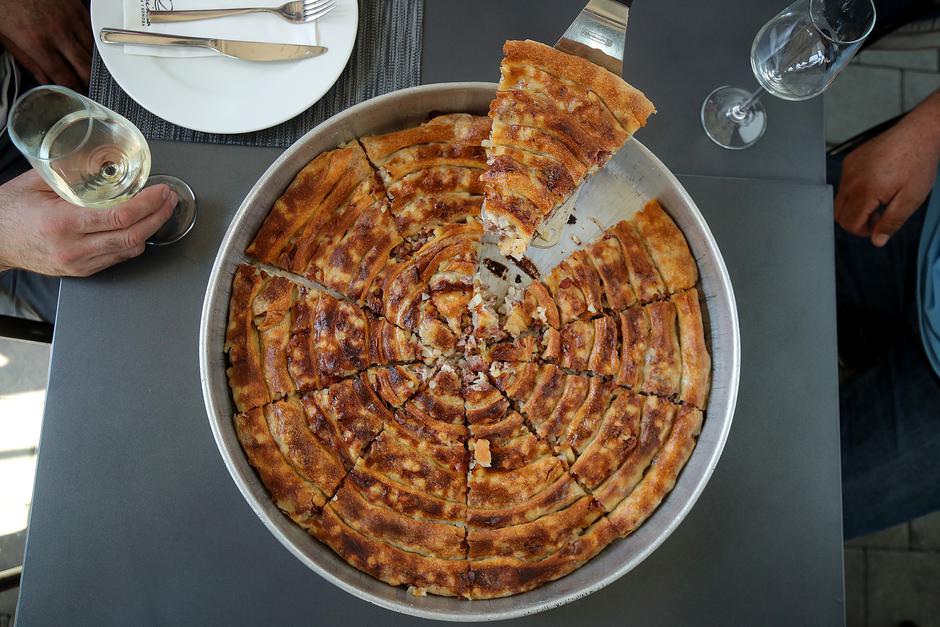 – Ma ne. Mislim, možete, ali mlijeko se uz burek pije, odgovor je. I uistinu, prava je kombinacija efektna, doista burek od mesa i kiselo mlijeko nevjerojatno pašu jedno s drugim. U Marineru prave i pite, sirnicu i zeljanicu koja se radi isključivo od svježe blitve. Kada smo govorili o umijeću pripreme jela ispod peke ili sača, kako se još naziva, nismo mislili samo na burek, koji očito traži da pekar točno zna napraviti žar koji će ispeći krumpir i meso te tijesto napraviti hrskavim, a ne krutim. Vjerujte, iako je bogat, duvanjski burek u Marineru iznenađujuće je lagan zalogaj. Mislili smo i na možda i najpopularnije jelo ispod peke u nas, a to je, dakako, teletina.
