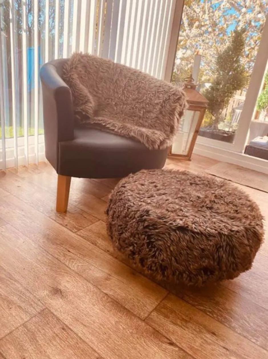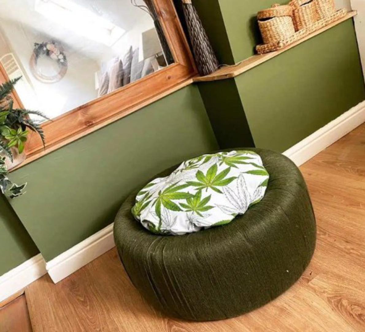 Za naslon za noge uzela je još jednu cijelu gumu i prekrila je tkaninom. S jedne strane gume stavila je drvo, koje je prekrilo rupu, te četiri drvene noge.