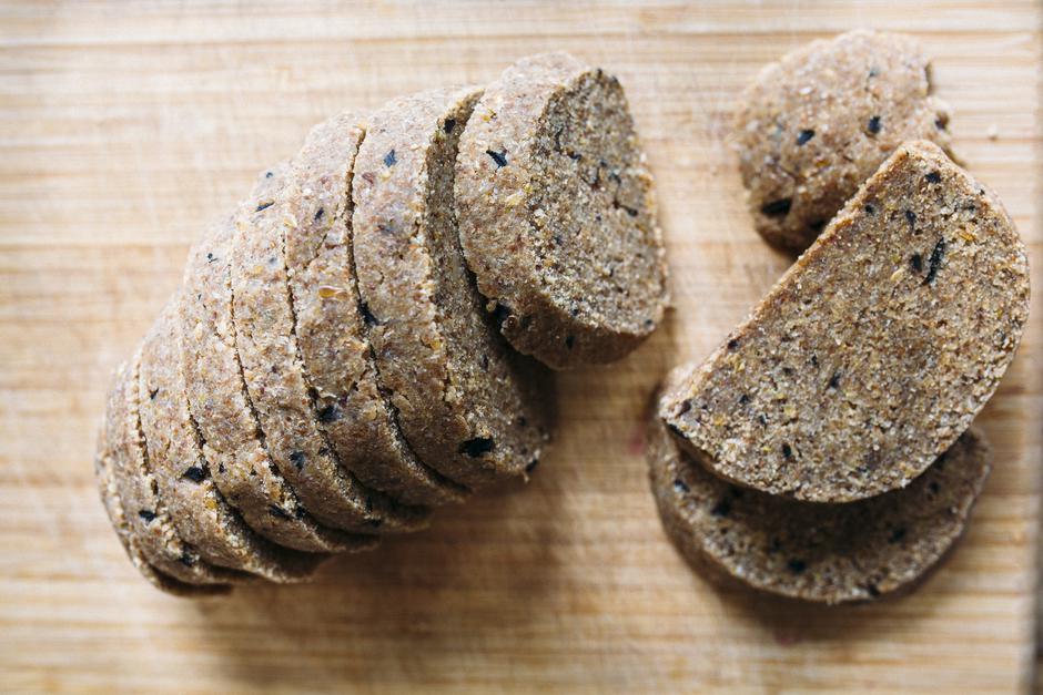 Pomiješajte češnjak, datulje i sok od limuna u kvalitetnom blenderu do glatke smjese (kao da radite pastu od datulja) s mrvicom vode. Dobivenu pastu miješajte rukama sa svim preostalim suhim sastojcima. Kada ste dobro umijesili, dodajte začine i masline, te jednu žlicu domaćeg maslinova ulja. Smjesu oblikujte u dvije štruce, premjestite ih na rešetku ili lim za pečenje i ubacite u pećnicu koju ste prethodno zagrijali na 46°C i dehidrirajte ga 15 sati. Najbolje da ga večer prije stavite u pećnicu i izvadite ga ujutro prije nego što krenete na posao.
