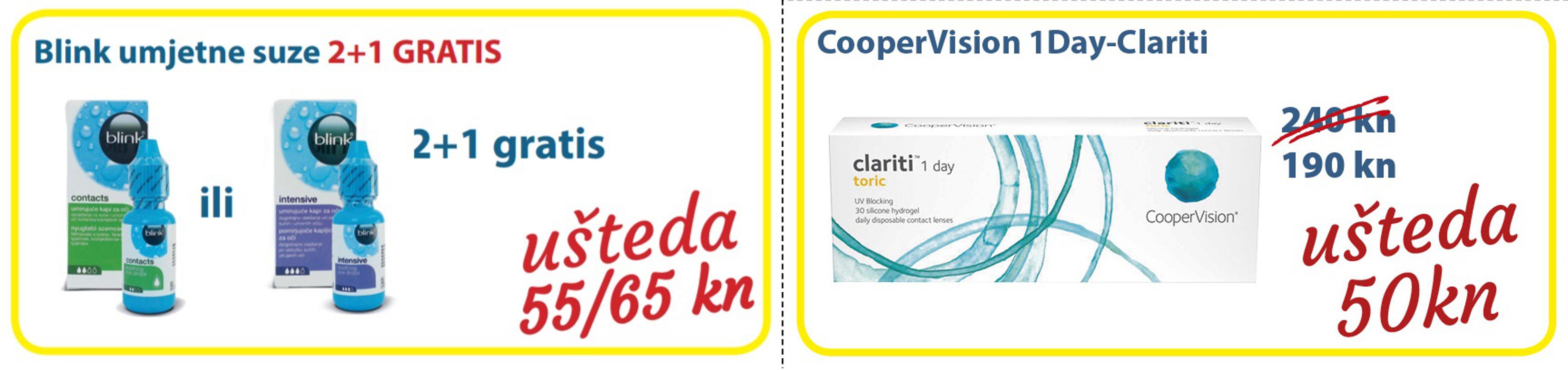 Jedan od naših najpopularnijih kupona je BLINK 2+1 GRATIS, a tu je i kupon s 50,00 kn popusta na clariti jednodnevne kontaktne leće.