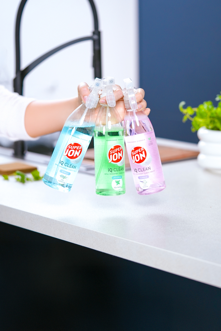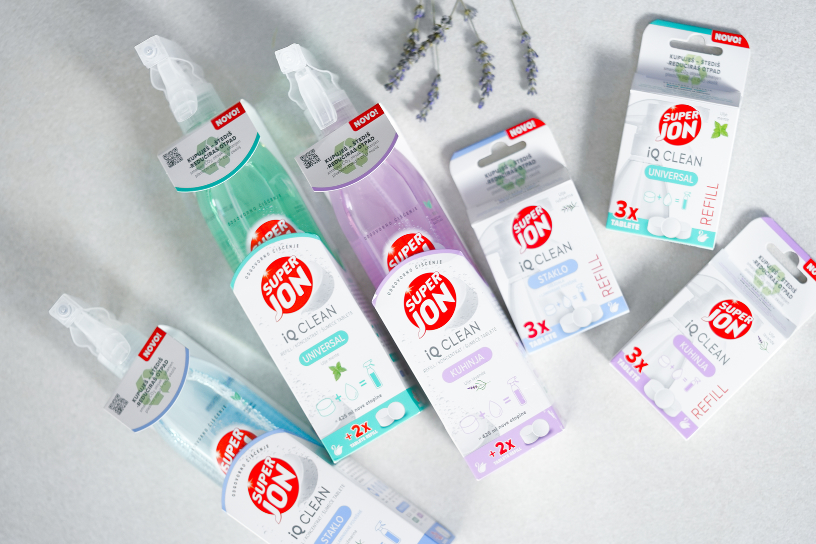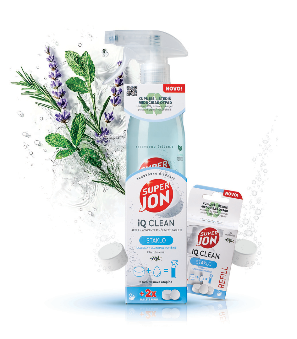 Super Jon iQ Clean - nova revolucionarna linija sredstava za čišćenje iz Labuda - u samo jednoj „čarobnoj“ tableti objedinjuje praktičnost, sigurnost i ekološku odgovornost, uz uštedu novca, prostora i vremena. Svako pakiranje sadrži čak tri punjenja sredstva za čišćenje - nakon što se jedan potroši, drugi je spreman već za desetak minuta otapanjem tablete u toploj vodi. Super Jon iQ Clean liniju čine tri proizvoda: Universal, Staklo i Kuhinja s prirodnim uljima mente, lavande i ružmarina.