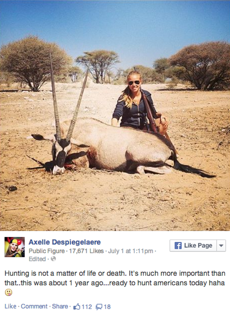 Belgijka se prije utakmice sa Sjedinjenim Američkim Državama pohvalila na svom Facebook profilu fotografijom sa safarija u Africi, gdje pozira kraj ubijene oriks antilope. Puška i njezin osmijeh jasno sugeriraju da je ona ta koja je ispalila smrtonosni metak u nesretnu životinju.