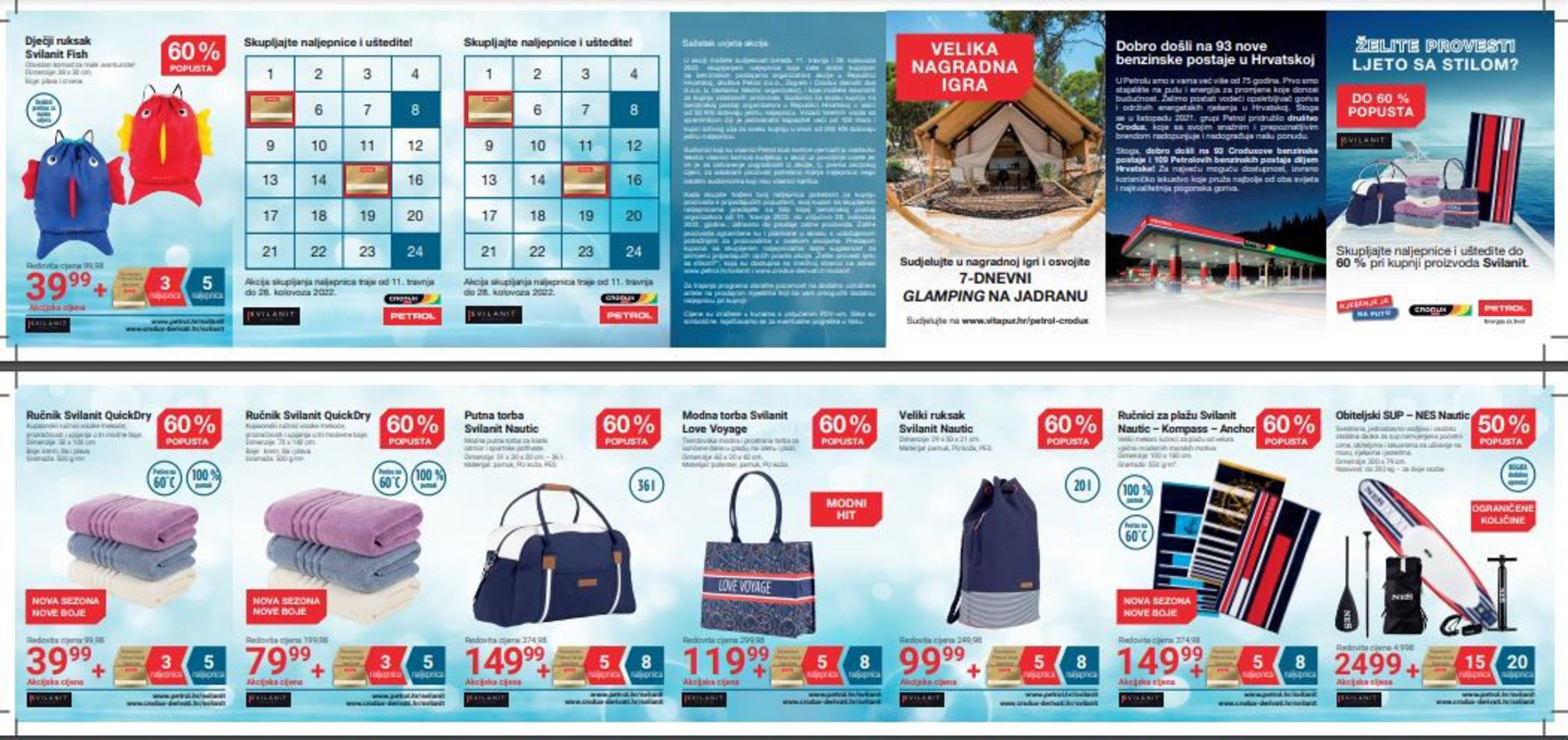 Za takve poduhvate ne treba vam posebna oprema, ni pretjerana priprema. Sve možete kupiti i usput. Petrol i Crodux ponudili su odlične akcijske cijene na sve potrebne proizvode za ugodno ljeto. Tako na jednom mjestu možete kupiti i ručnike, i dječje ruksake, ali i osvojiti nagrade. Osim opreme, Petrol u svojim letcima ima i poneke ideje za destinacije. Letak možete vidjeti na poveznici.
