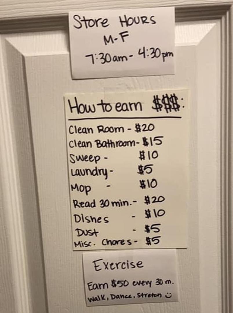 Svaki kućanski posao iznosi određenu količinu ‘novaca’, to jest lažnog novaca iz igre Monopoly, kojim onda njen sin može ‘kupiti’ aktivnost koju želi, poput odmaranja, igranje videoigrica te kupovanje grickalica i slatkiša. Njezina objava izazvala je veliku pozitivnu reakciju te oduševila druge roditelje.
