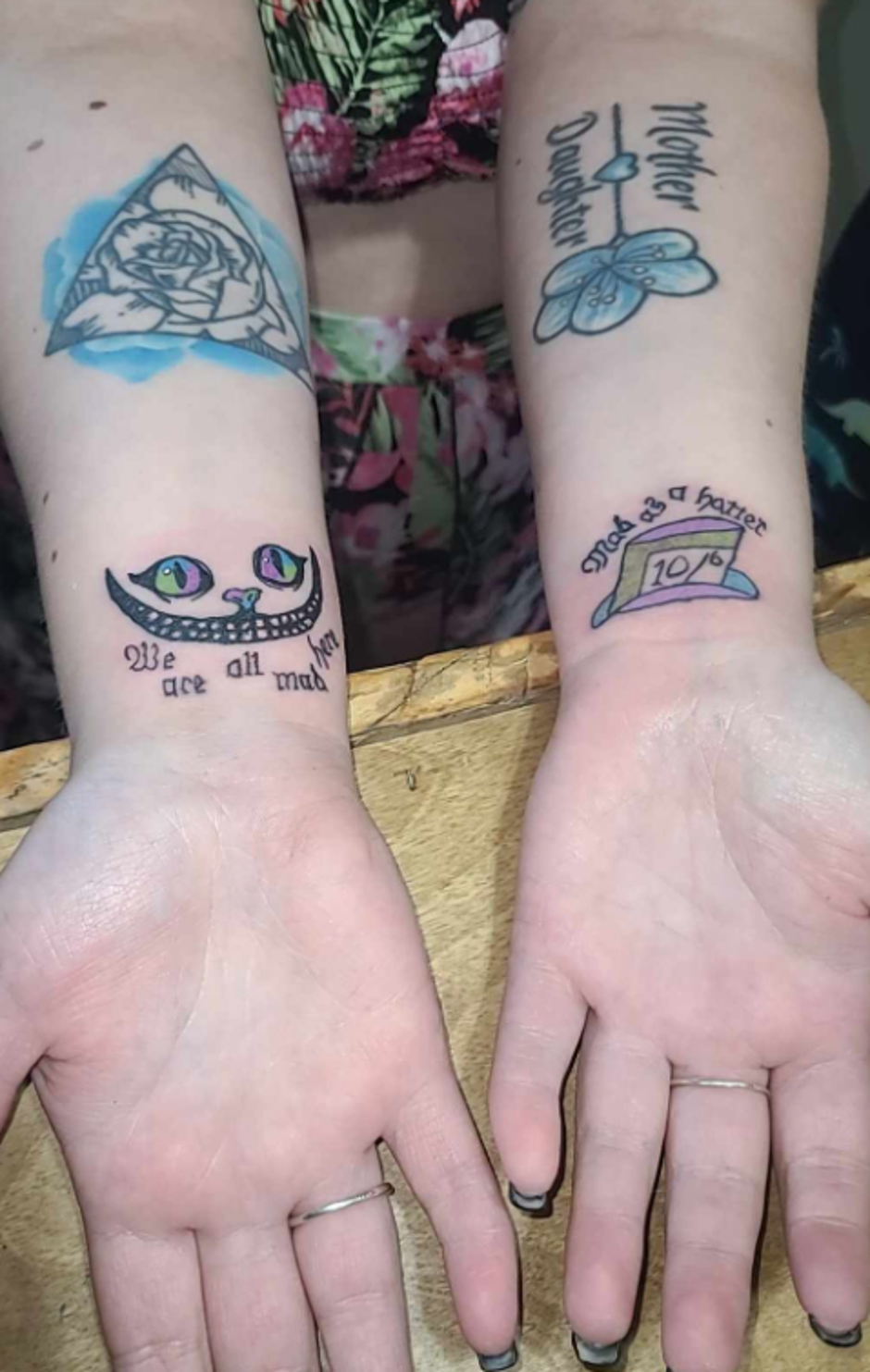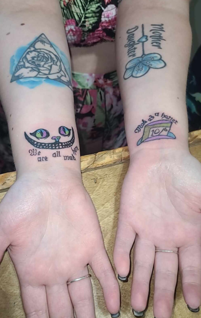Desno zapešće bilo je obojeno šeširom Ludog šeširdžije i natpisom "lud kao šeširdžija". Sljedeća je bila fina linija bočnog profila ženskog lica na drugoj nadlaktici i par ruku s vazom s cvijećem na podlaktici. Njezina druga podlaktica zatim je ukrašena nekim zamršenijim crtama, ovaj put prikazujući ljudsko srce. Također je tetovirala male crtane duhove zajedno s tetovažom zmaja.
