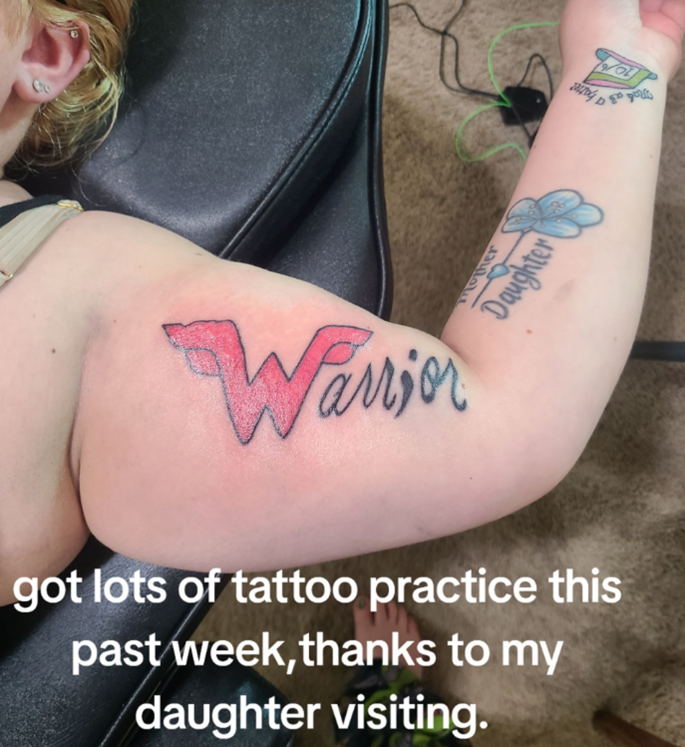 "Prošli tjedan sam puno vježbala tetoviranje, zahvaljujući posjeti moje kćeri", napisala je. Iako je njezina kći punoljetna i pristala je na tetoviranje, sami crteži su zaprepastili ljude. Prva tetovaža bila je veliki natpis na njezinoj nadlaktici, s crvenim slovom W i 3D krilima, te kurzivnim natpisima na ostalim slovima.