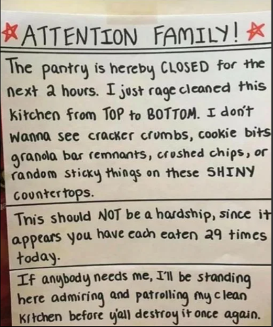 "Kuhinja je zatvorena iduća dva sata. Upravo sam ju pospremila i očistila od vrha do dna. Ne želim nikakve mrvice od krekera, kruha, keksića, granole i slično. Čips i ljepljive stvari također ne dolaze u obzir. Ovo vam ne bi trebalo teško pasti s obzirom na to da ste svi jeli već 29 puta danas. Ako me itko treba, divim se svojoj kuhinji koja je napokon čista - dok vi opet ne uđete u nju."