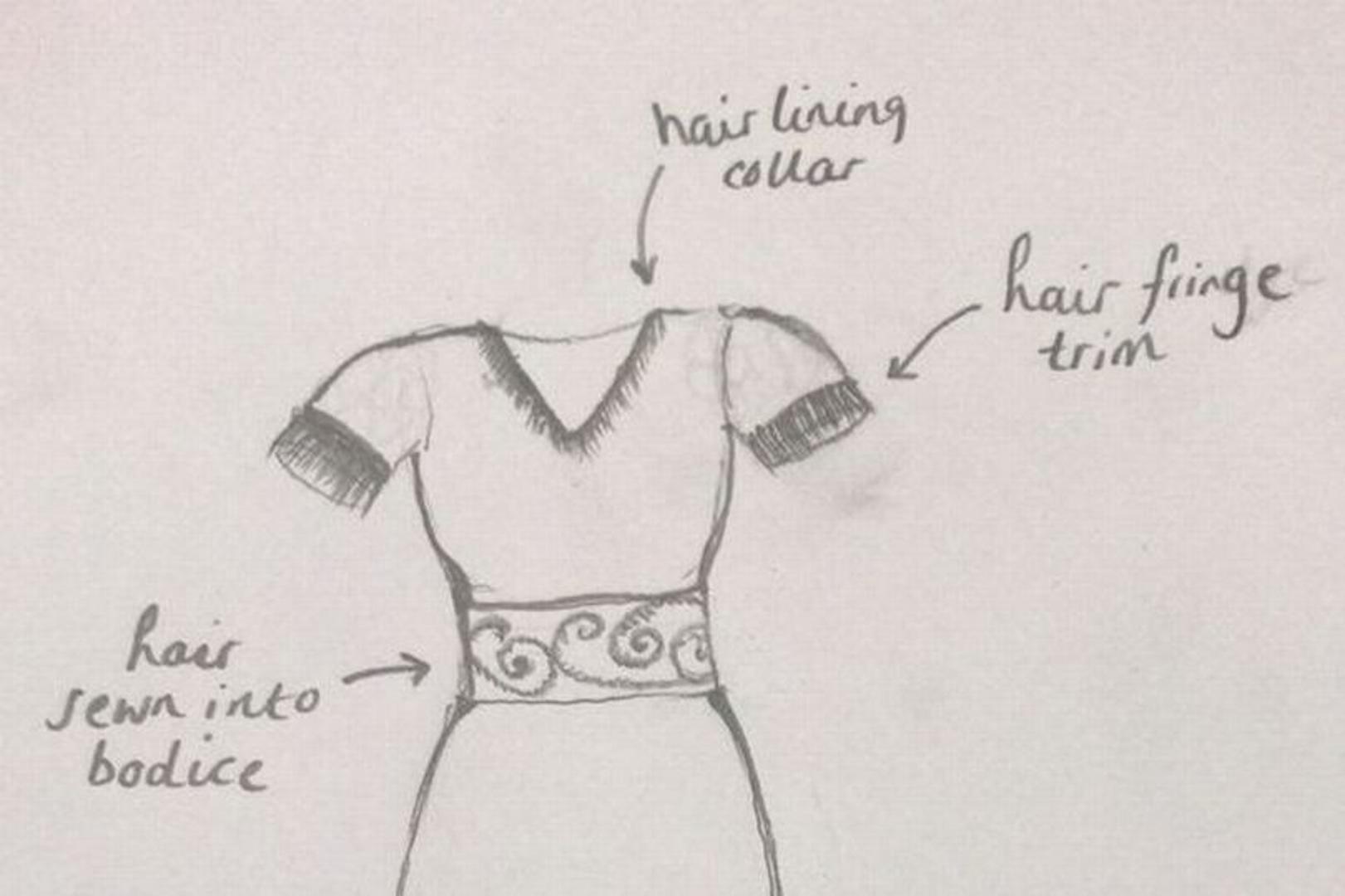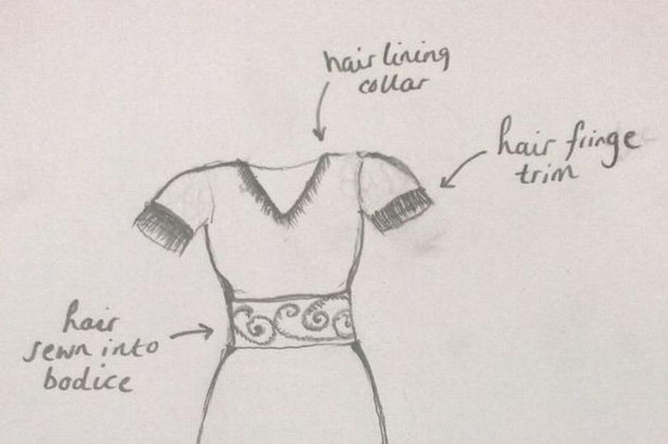 Haljina, koja bi trebala biti ista kao ona njezine majke koja se udala 1953. godine, trebala bi biti ukrašena majčinom kosom na području trbuha, na rukavima te na ovratniku, a rok je kolovoz iduće godine, na godišnjicu smrti njene majke.
