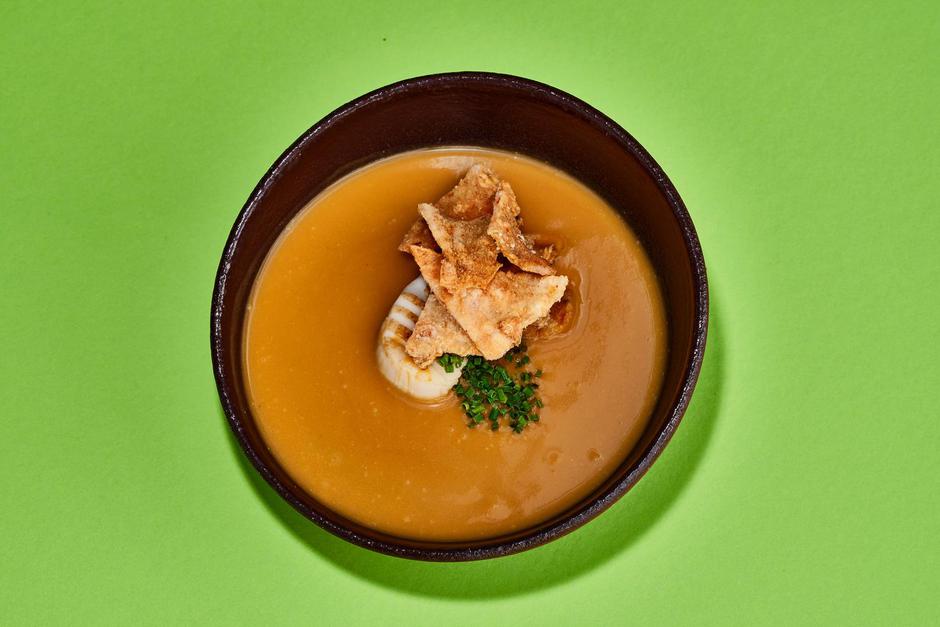 Ako su opisane juhe možda ipak prekomplicirane za izvedbu, evo jednog jednostavnijeg rješenja, po izgledu i okusu opet uzbudljivog i novog: juha od batata s morskim plodovima. Slatkasta juha od batata s mineralnim okusima sigurno je jako dobra i vrlo zanimljiva kombinacija. Batat kuham u vodi, a potom ga izblendam u thermomixu.