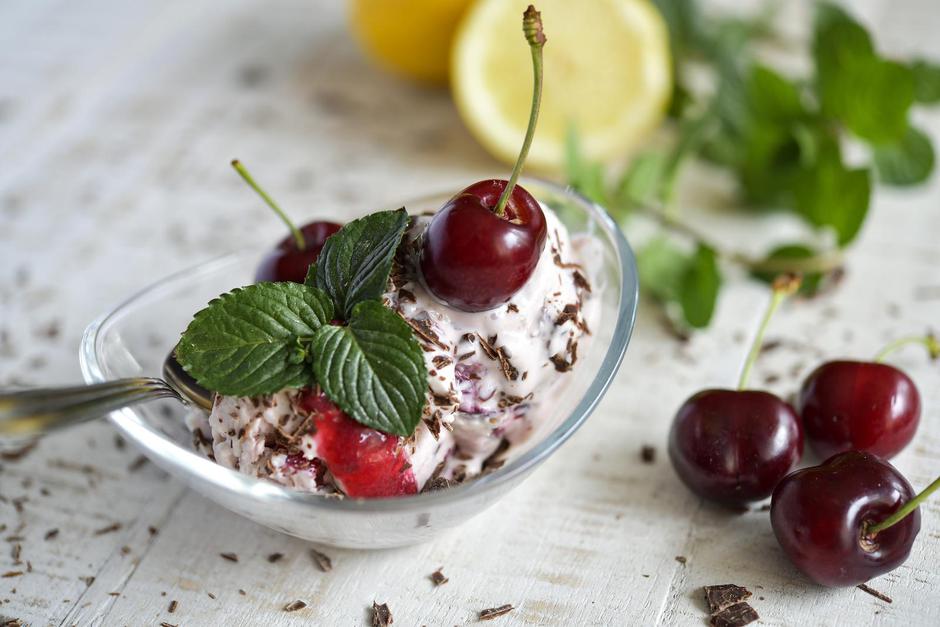 Želite li da trešnje u sladoledu zadrže mekoću, možete ih malo posuti šećerom i pustiti da se namaču u vlastitom soku. Kod pripreme sladoleda dodajte voće na samom kraju. Ne možete li bez čokolade, pospite sladoled krupno ribanim komadićima ili čokoladnim sirupom.