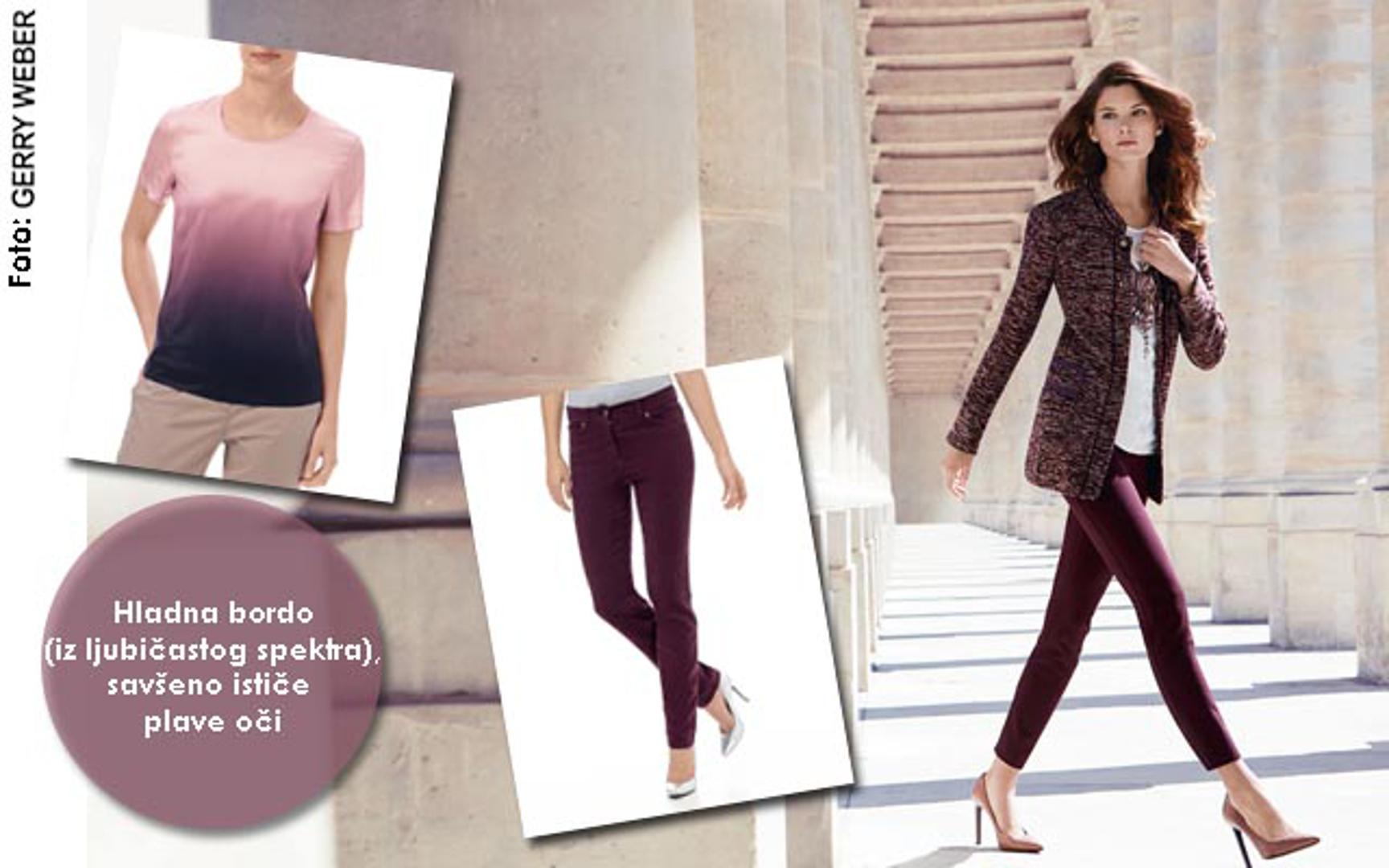 U ovoj sezoni neka budu svi temeljni odjevni predmeti u ovoj boji. Nositi ih možete zajedno (jedna nijansa=total look) ili odvojeno usklađujući je s ostalim bojama spektra. Kako kombinirati? Nosite li bordo boju koja izlazi iz crvenog spektra kombinirajte je uz crvenu i tamno plavu. To je spoj s kojim ne možete pogriješiti. Bordo koja izlazi iz ljubičastog spektra savršeno pristaje uz ljubičastu i zelenu. Pazite samo na jačine zelene i ljubičaste. Moraju biti čiste boje koje dolaze iz prirode.